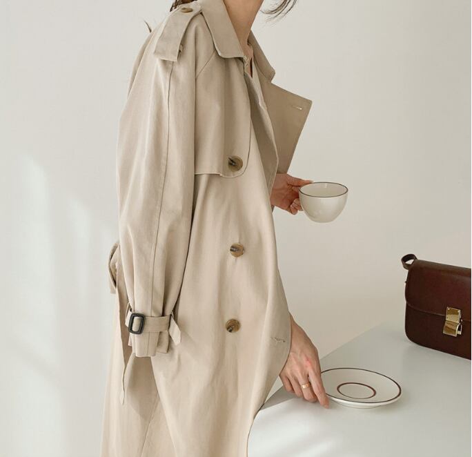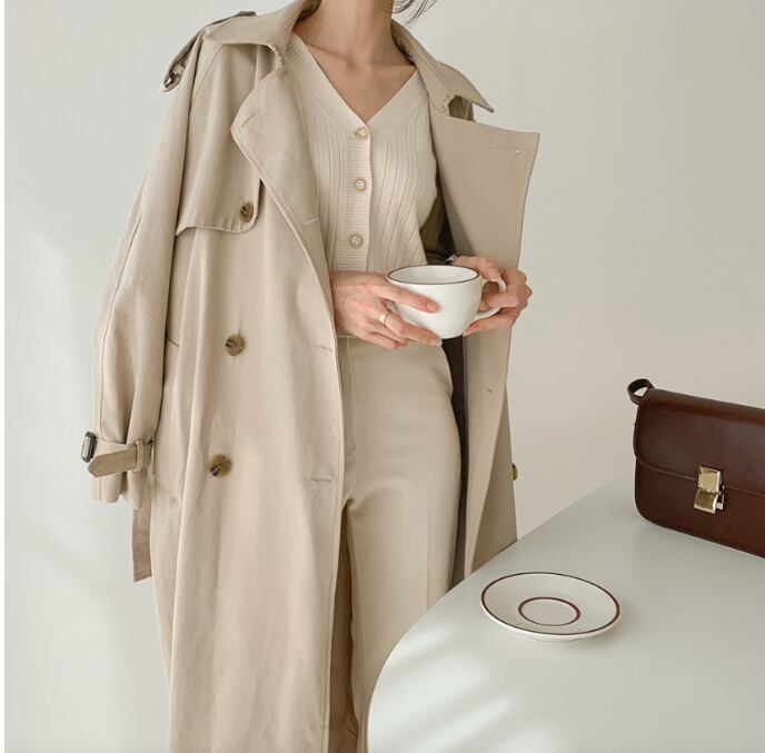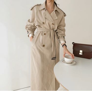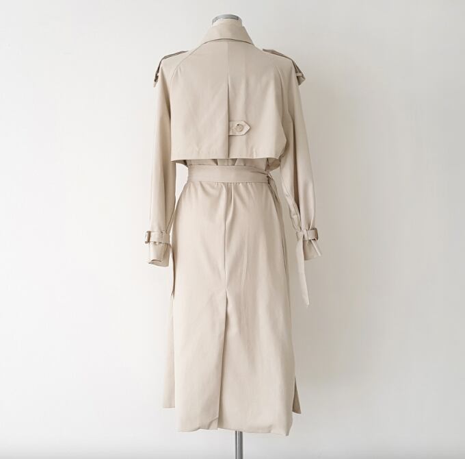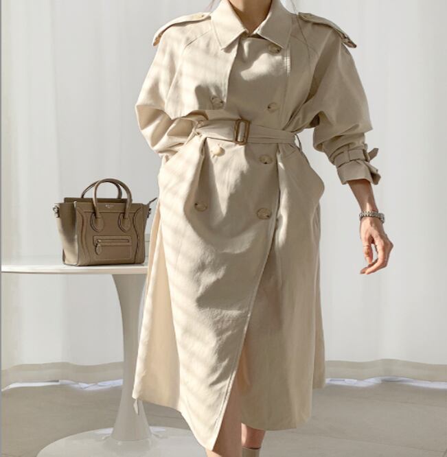 角襟&ダブルボタンがクラシカルな印象を与える、膝下丈のトレンチコート。