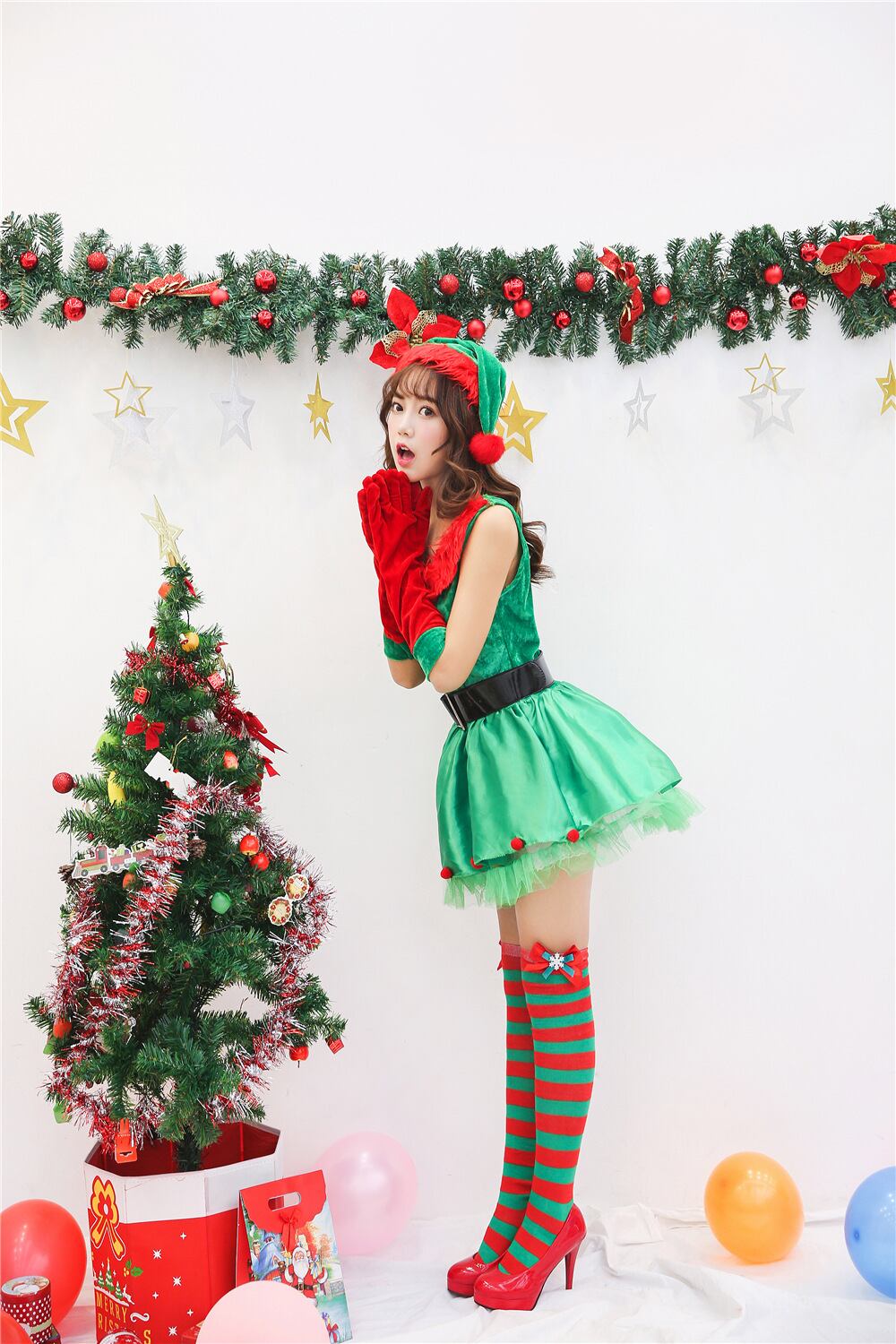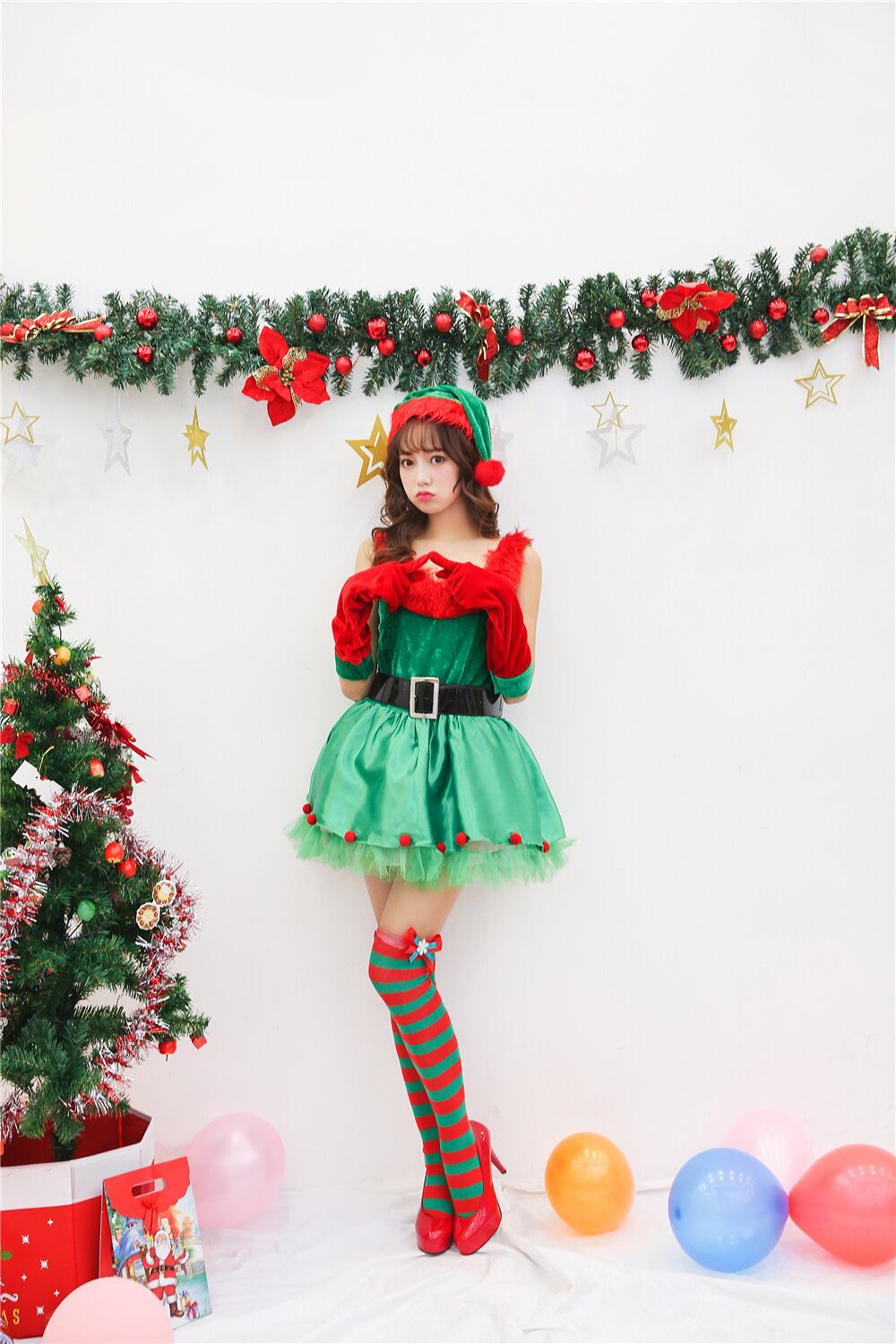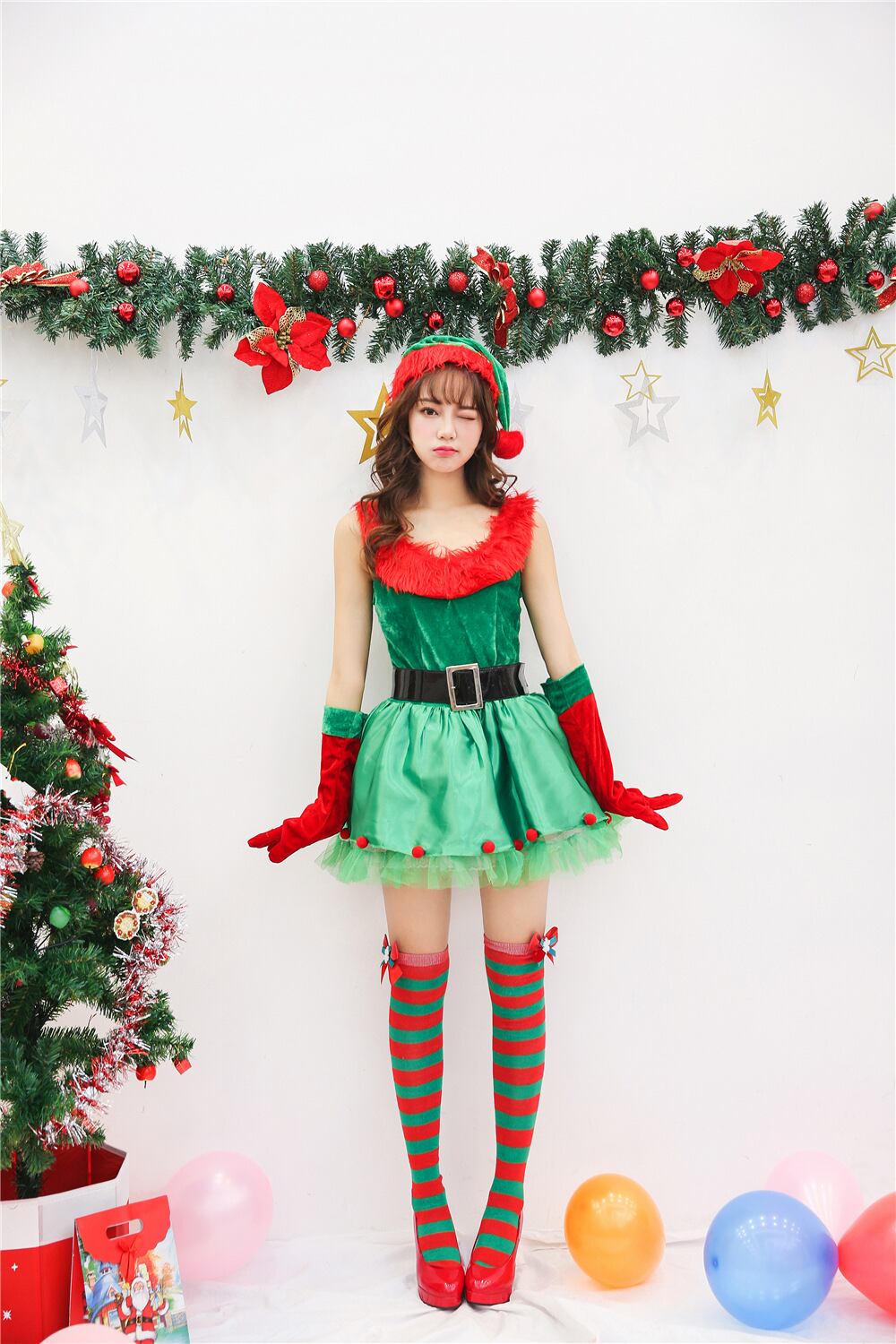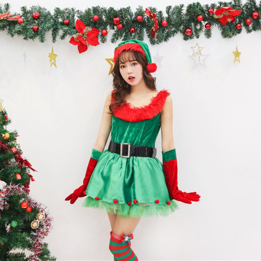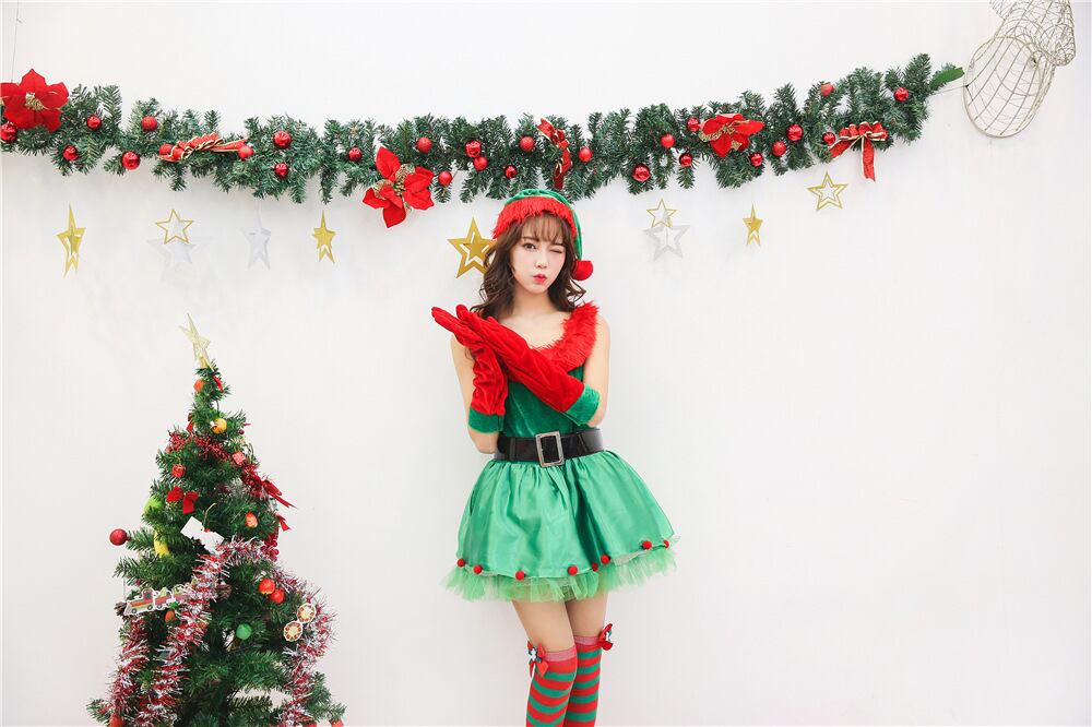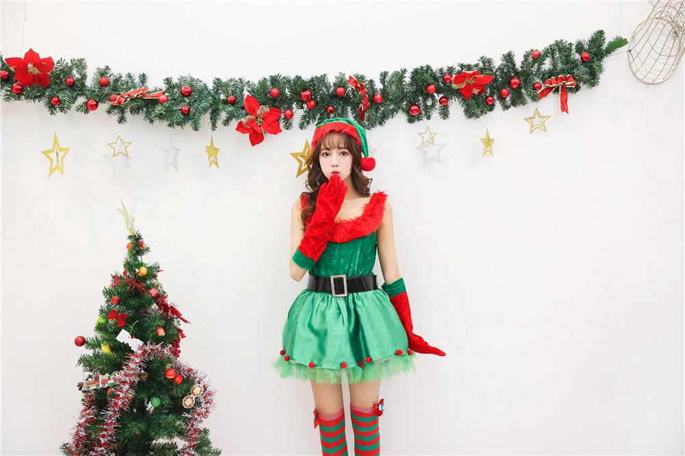 グリーン×レッドのバイカラーワンピースは、ネックラインに赤いファーをあしらい、華やかさ満点。ベロアのトップに、サテン&チュールのフレアスカートがガーリーでラブリーな印象を演出します。帽子・グローブ・ベルトがセットで、誰でも簡単にスタイルアップ。ホリデーイベントや女子会にもぴったりの、ロマンティックでキュートなコスチュームです。