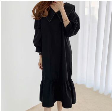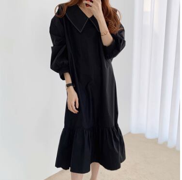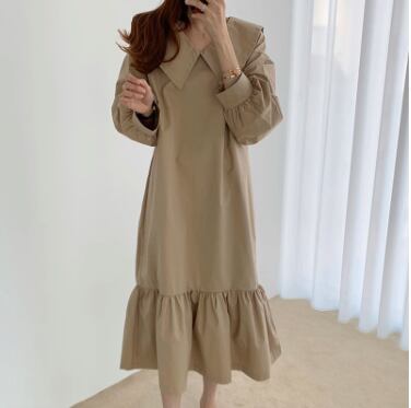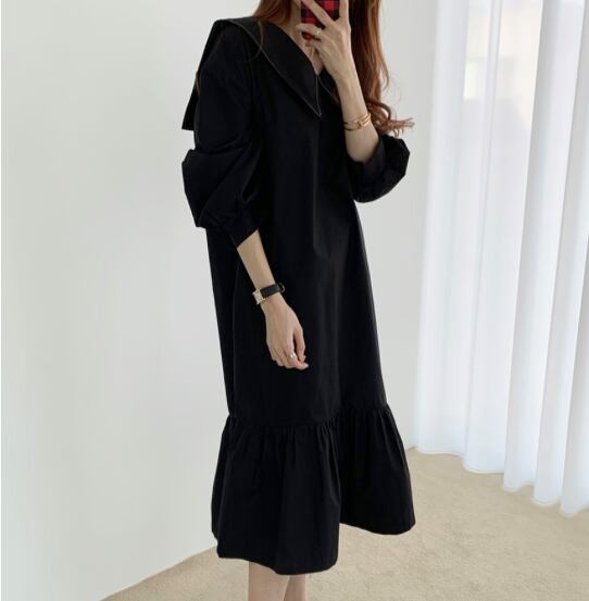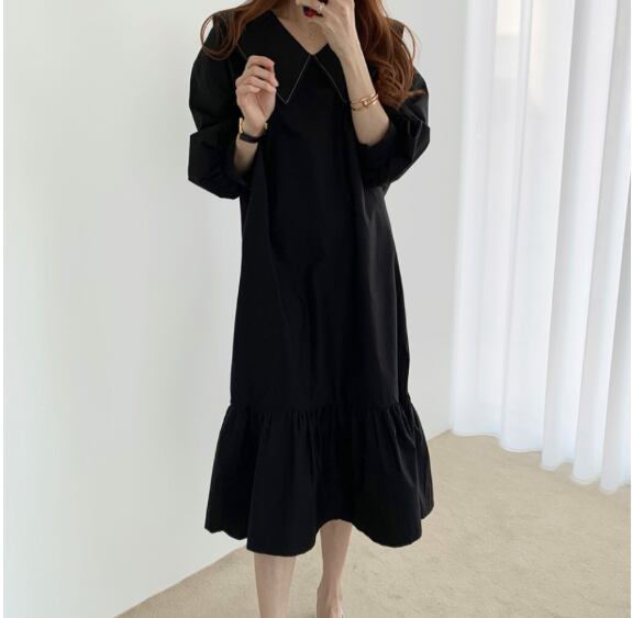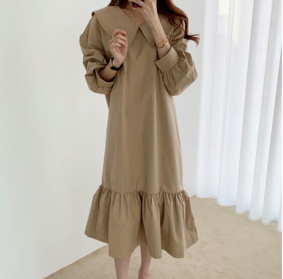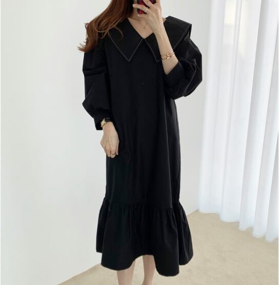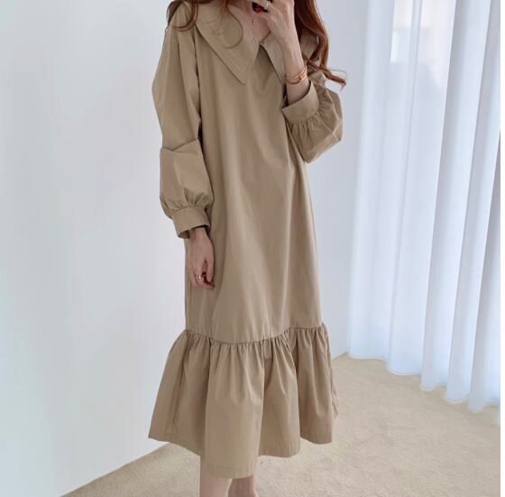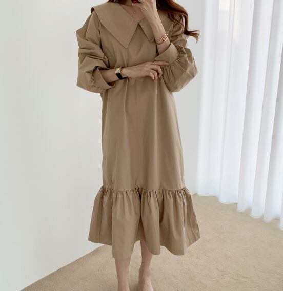 レディース ワンピース ドレス ミモレ ミディ ミドル 長袖 ボリューム袖 カフスリーブ ドロップショルダー 襟付き 角襟 ビッグ襟 ビッグカラー セーラーカラー セミフレア オーバーサイズ 切り替え 裾ワイド フェミニン フリル ギャザー 裾フリル かわいい 大人可愛い きれいめ シンプル 上品 おしゃれ クラシカル ロマンティック 無地 春 秋 ママ デート お出かけ レストラン 休日 ショッピング 楽ちん 体型カバー 普段使い モテ M L XL ゆったり ゆる 黒 ブラック カーキ 大人カラー