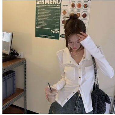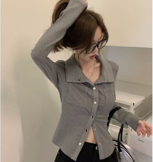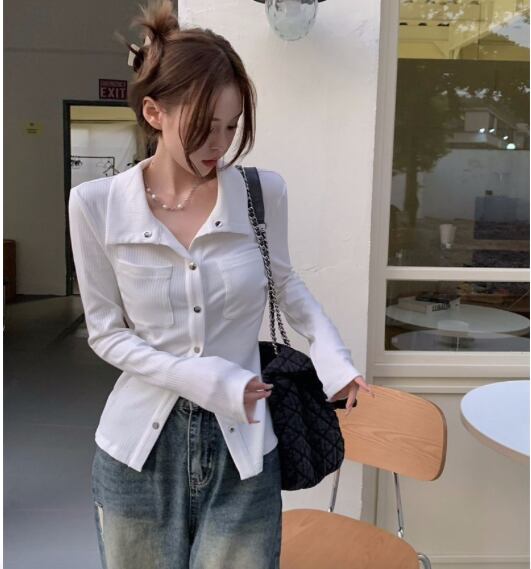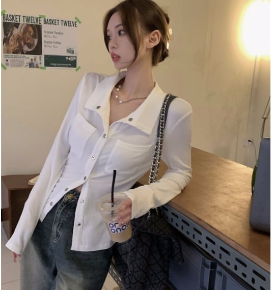 レディース トップス シャツ 長袖 ロングスリーブ 襟付き 角襟 タイト スリム ボディコンシャス ポケット リブ 前開き ボタン きれいめ シンプル カジュアル おしゃれ かっこいい こなれ感 ラフ 抜け感 ベーシック ワイルド セクシー 色気 無地 春 秋 ママ 学生 学校 通学 デート お出かけ 旅行 休日 ショッピング ライブ お花見 合コン コンパ カフェ ランチ 韓国 オルチャン コーデ 普段使い 着回し モテ 肌見せ S M L XL 白 ホワイト グレー ベーシックカラー 大人カラー
