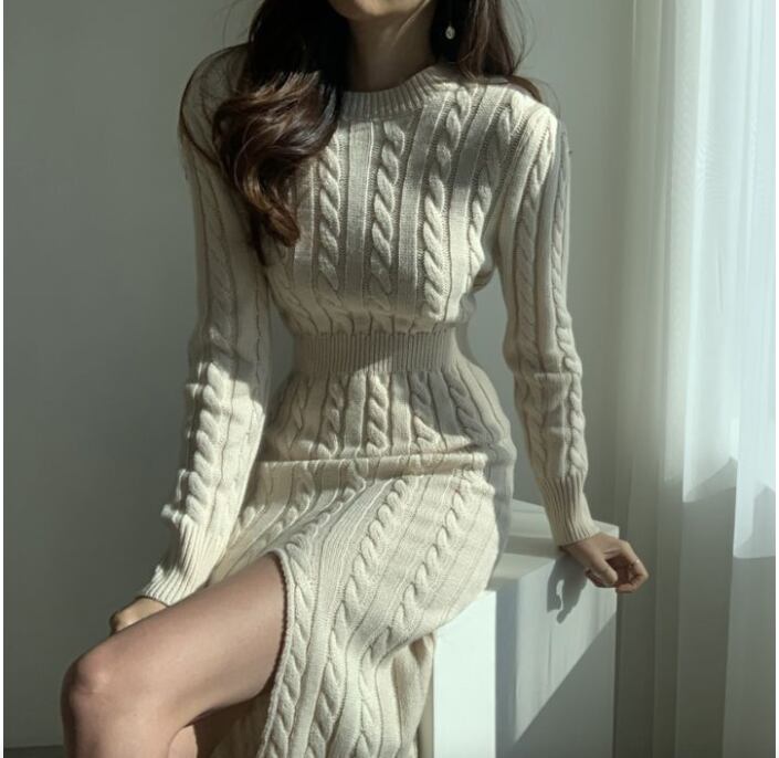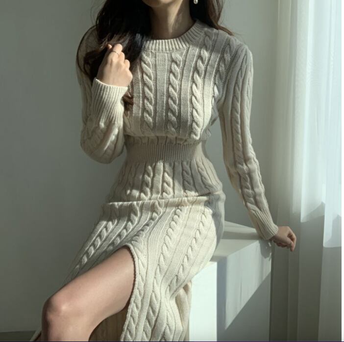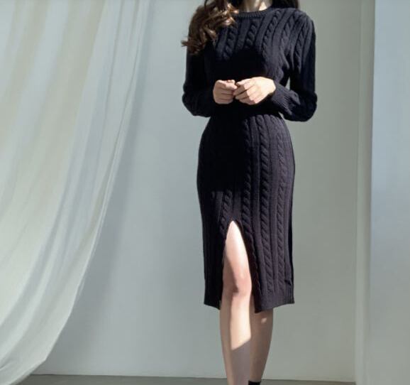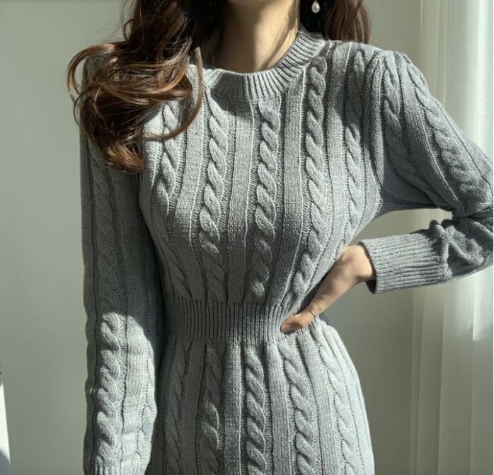ケーブルニットの立体感とクルーネックのデザインが映える、大人可愛いミモレ丈ニットワンピース。