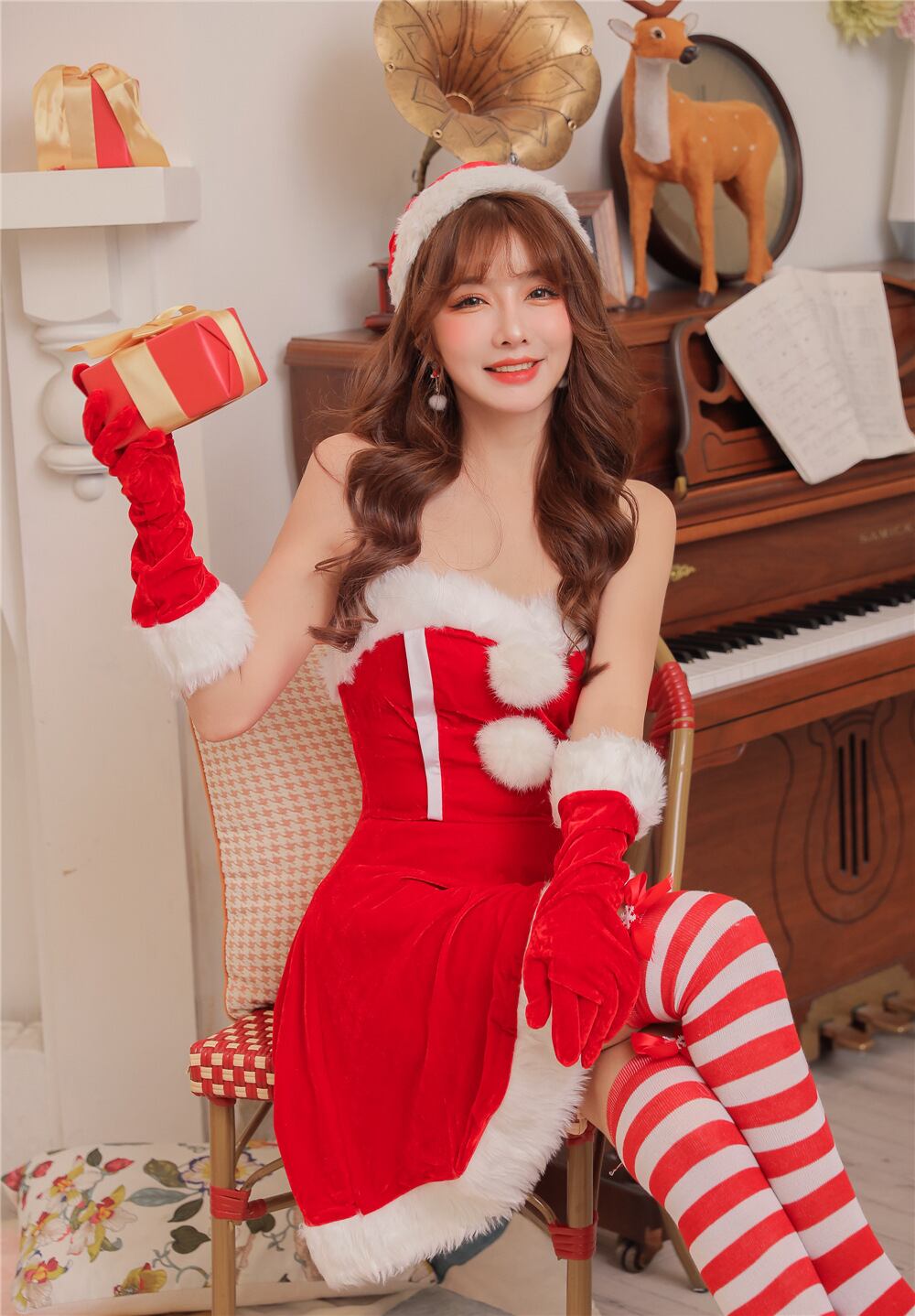 サンタコスチュームセットは、ワンピース・帽子・グローブ・ソックスの4点が揃ったお得なアイテム。ふわふわのファーとベルベットの組み合わせが冬らしいぬくもりを感じさせ、花びらのようなフレアが動くたびにキュートさを引き立てます。ハイウエストのAラインでスタイルアップも叶い、ベアショルダーの肌見せがほどよい色気をプラス。女子会やパーティー、イベントで「かわいい!」の声が集まる、ラブリーな主役級コーデを楽しんでみませんか?