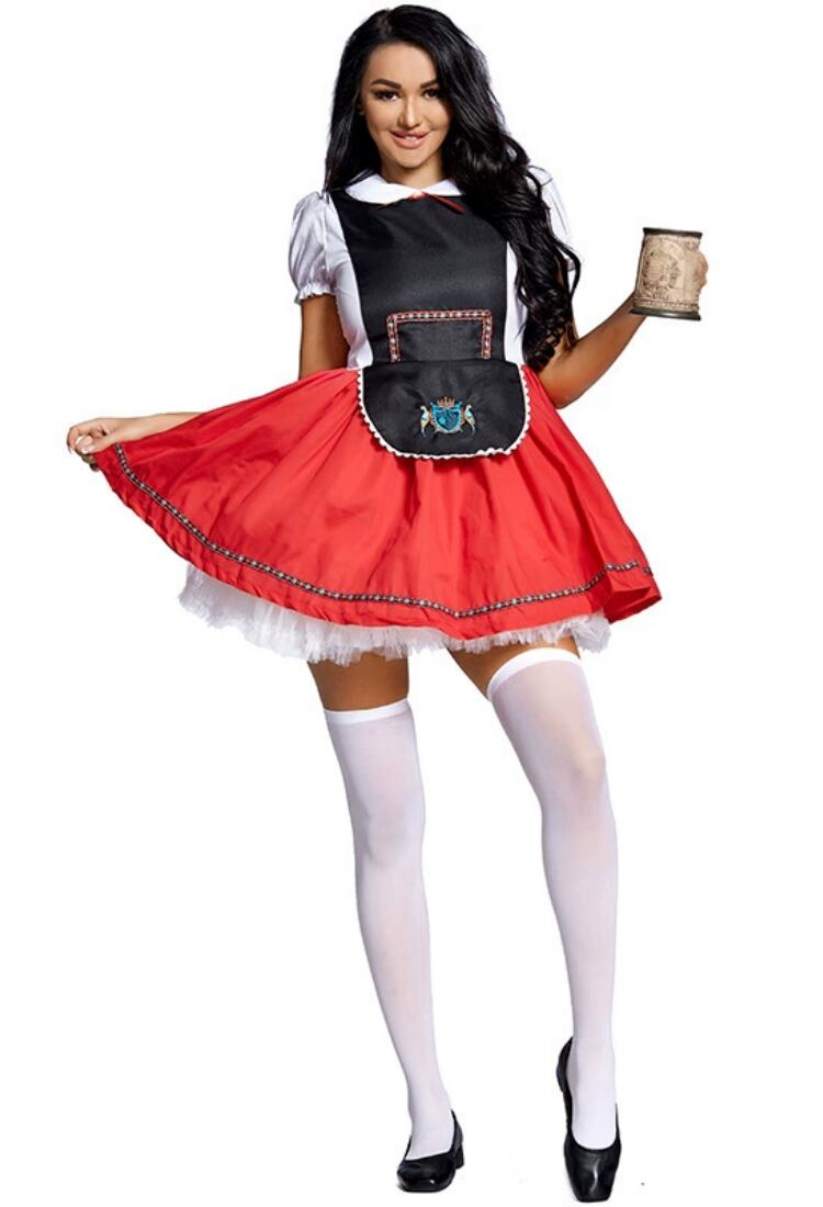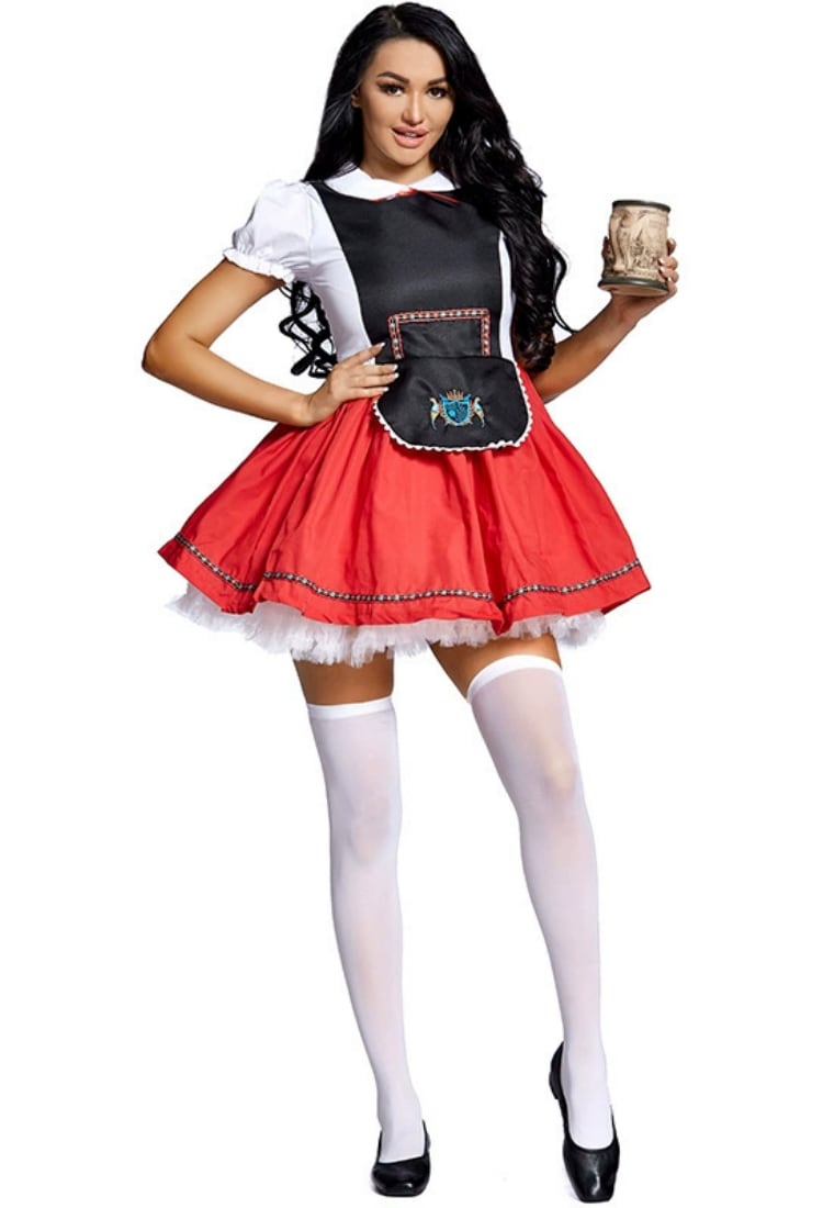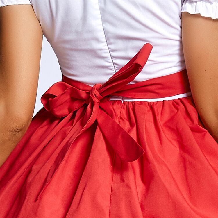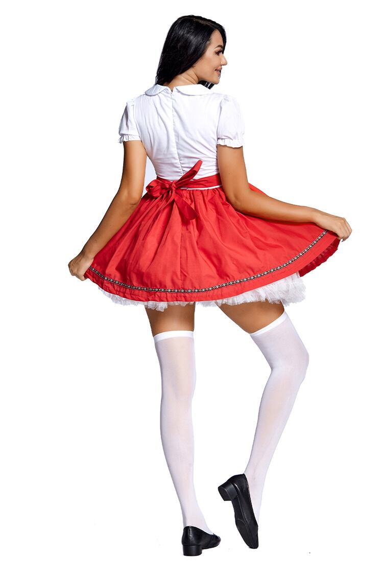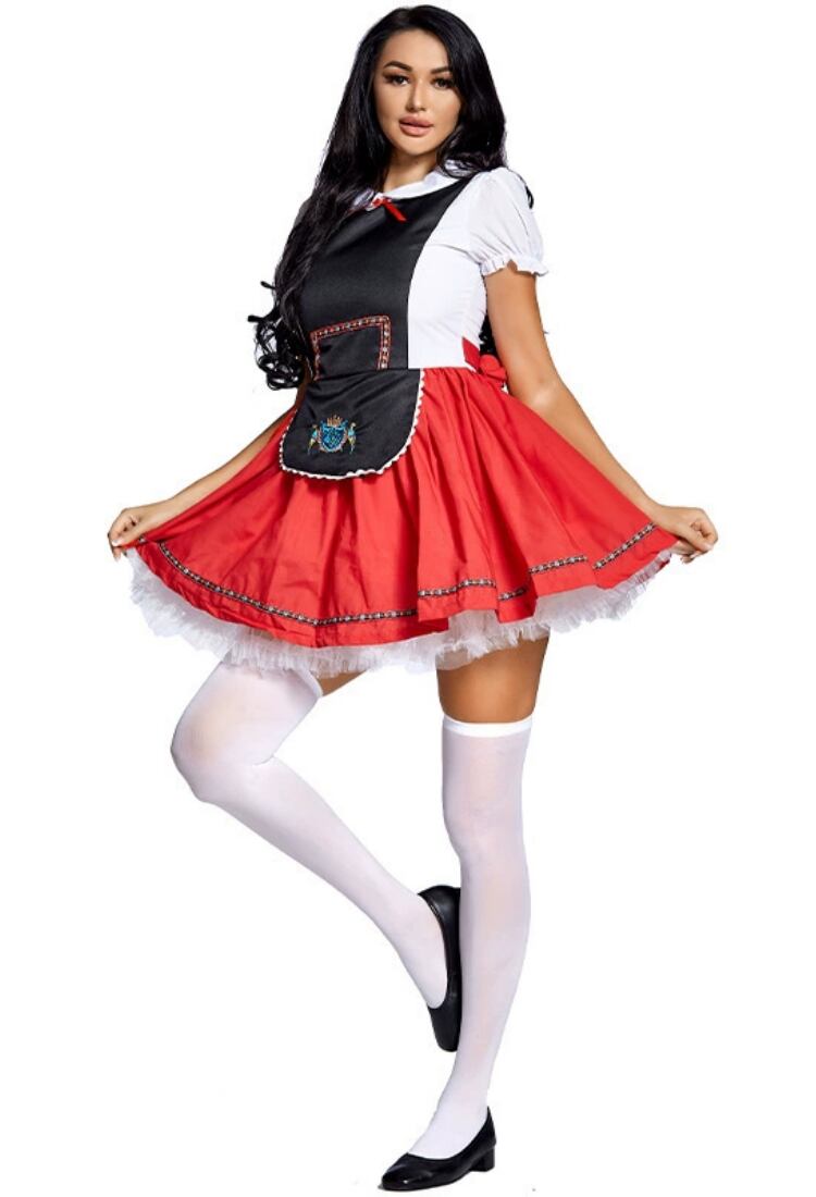ブラックとレッドを基調としたミニ丈のワンピースは、ハイウエストのAラインでスタイルアップを叶えつつ、パフスリーブや丸襟、ボウタイが可愛さと華やかさを引き立てます。バックにはリボンがあしらわれ、後ろ姿も抜かりなし。ドイツのオクトーバーフェストをモチーフにしたデザインで、ハロウィンや文化祭、学園祭などのイベントで主役になれる一着です。