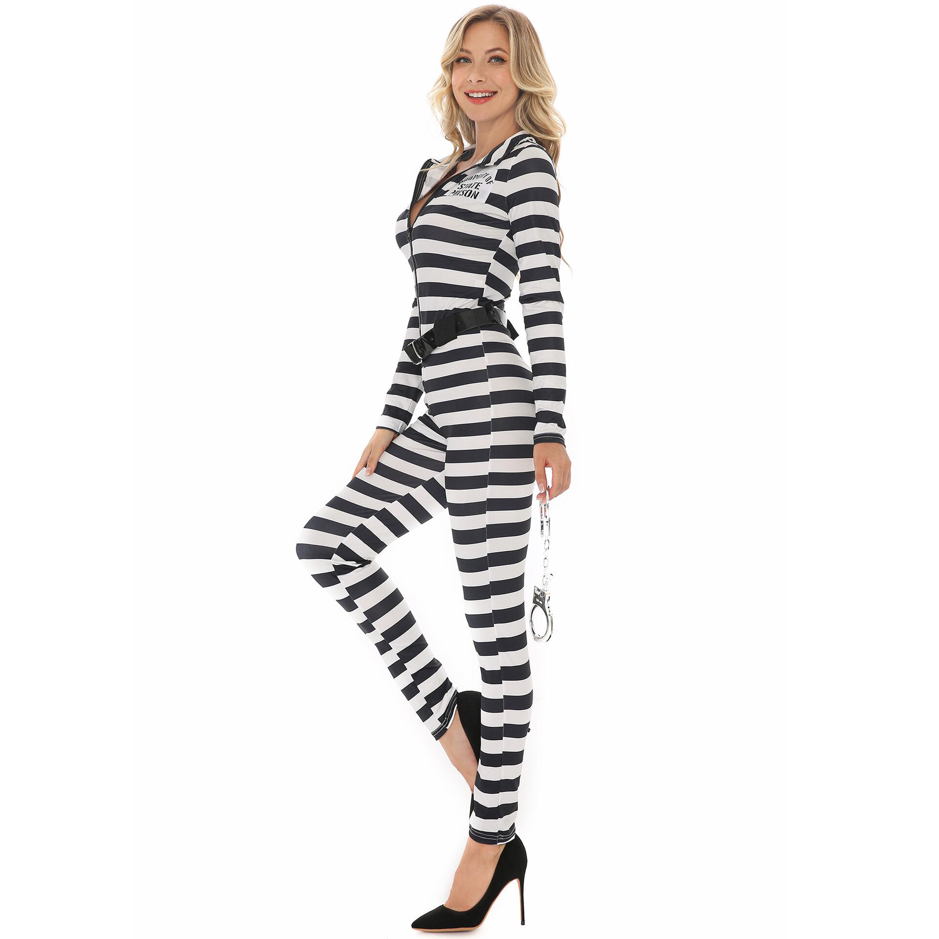 スリムフィットでスタイルを美しく引き立て、ウエストはベルトでキュッとマーク。大胆なボーダー柄とロゴプリントが印象的で、ホワイト×ブラックの配色がクールに決まります。囚人服のワイルドな要素に、かわいい&セクシーさをプラス。手錠も付属しており、仮装・衣装としても本格派。ハロウィン、文化祭、パーティーなど特別な日の個性派コスチュームとしてぴったりです。