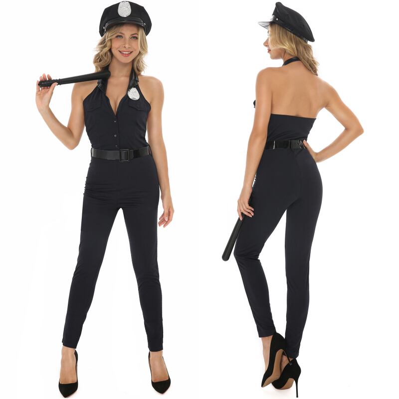 レディース オールインワン つなぎ ジャンプスーツ Vネック ホルターネック タイト スリム 細身 スキニー ボディコンシャス ベアバック ヌードバック ベルト ウエストマーク かわいい シンプル カジュアル おしゃれ かっこいい エキゾチック クール 主役級 存在感 アメリカン アクティブ ワイルド セクシー 色気 可愛い 秋 ハロウィン 文化祭 学園祭 パーティー イベント インスタ映え スタイルアップ 肌見せ ポリス 警察官 保安官 コスチューム 衣装 仮装 小物付き M L XL ブラック