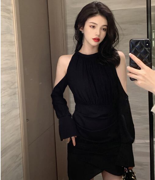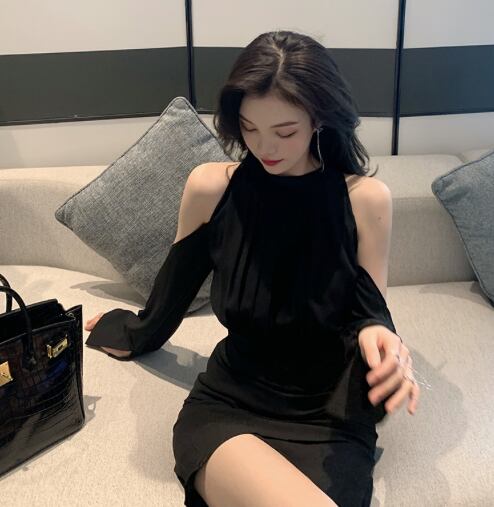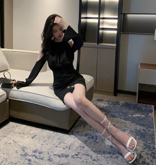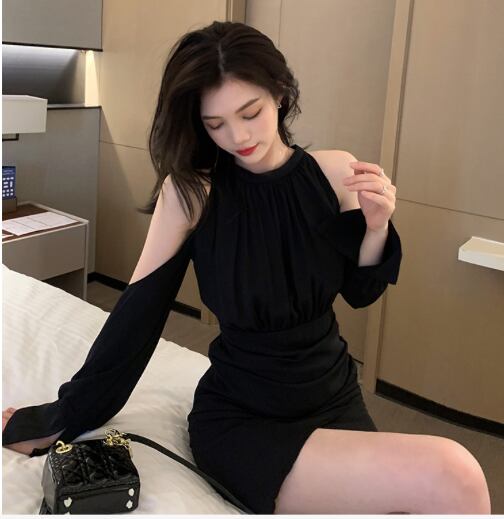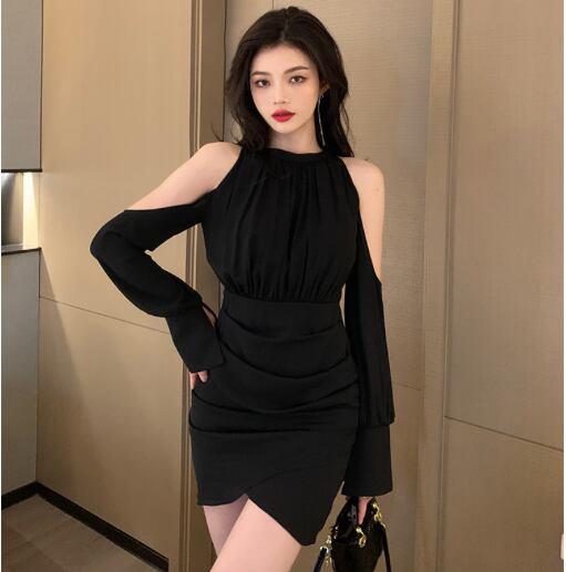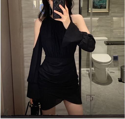 レディース ワンピース ドレス ミニ ショート 膝上 長袖 カフスリーブ オープンショルダー ベルスリーブ ラウンドネック 襟なし ノーカラー タイト ドレープ ボディコンシャス Xライン タック バックコンシャス ハイウエスト きれいめ 上品 おしゃれ かっこいい こなれ感 主役級 存在感 都会的 セクシー 色気 ドレッシー リュクス 無地 春 お呼ばれ デート お出かけ パーティー イベント リゾート レストラン 休日 バカンス ホテル 美脚 脚長 肌見せ S M L 黒 ブラック