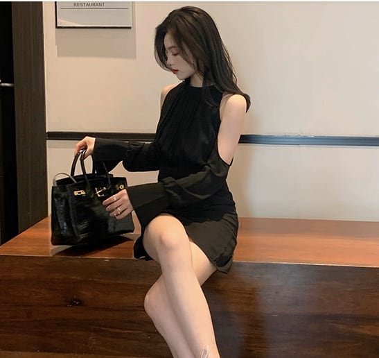 大胆なオープンショルダーと美しいドレープが視線を惹きつける、主役級のミニワンピース。