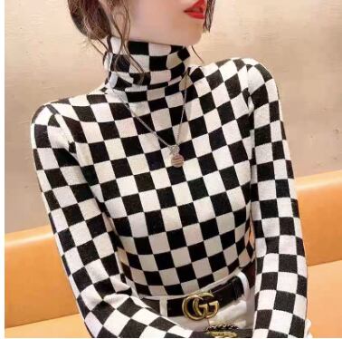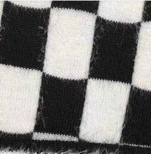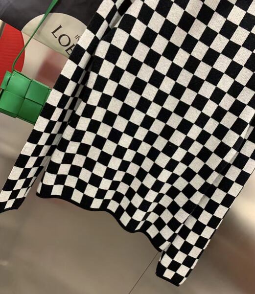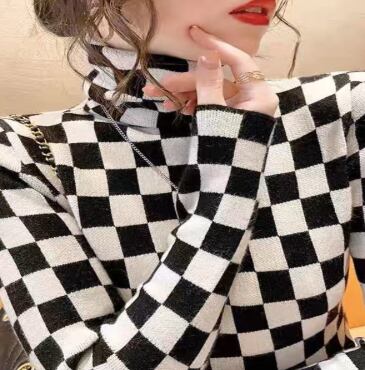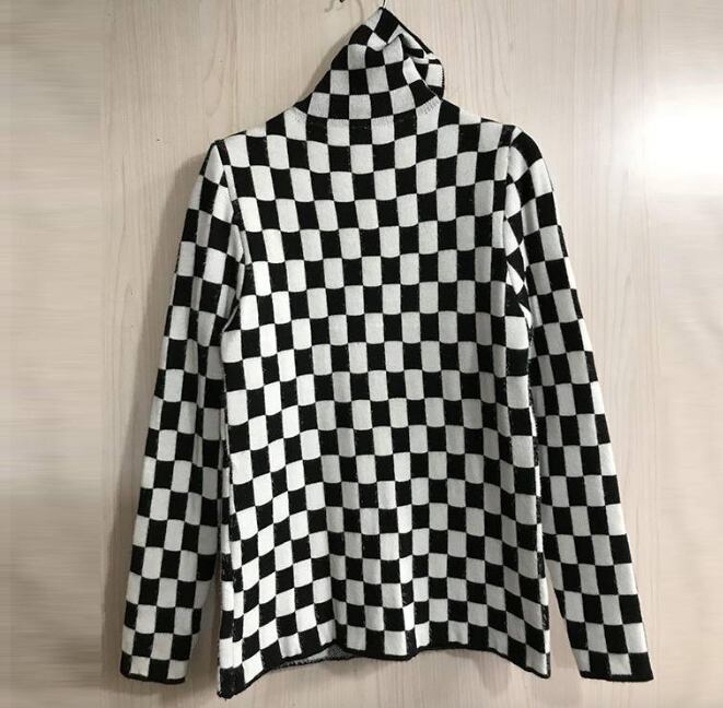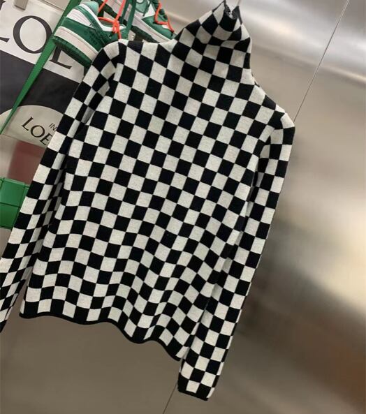 大胆なカラーデザインと格子柄が目を惹く、モード感漂うハイネックニットソー。