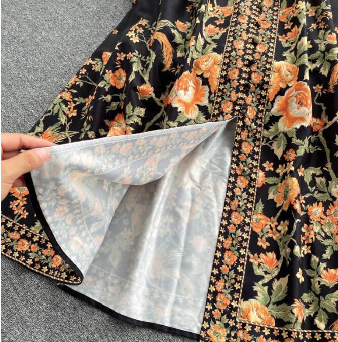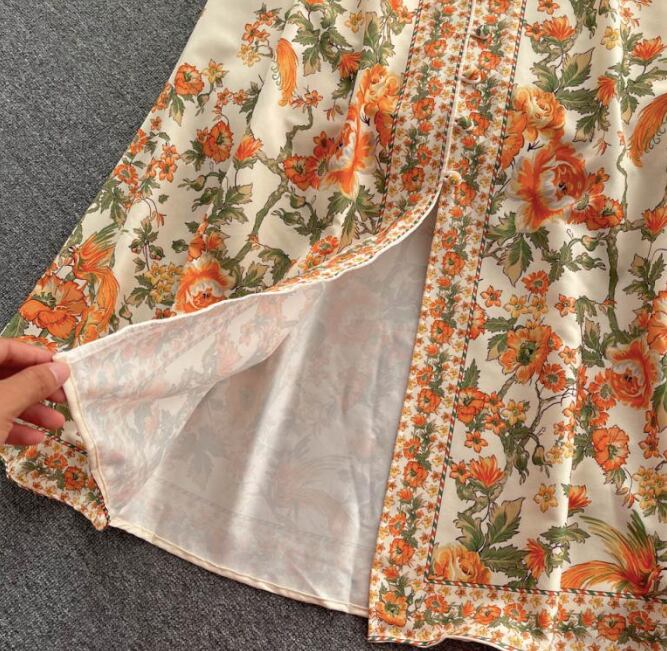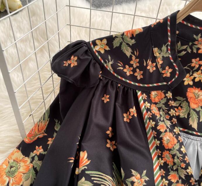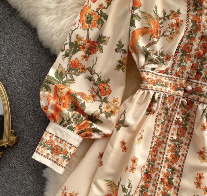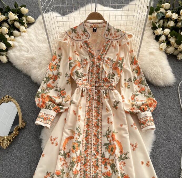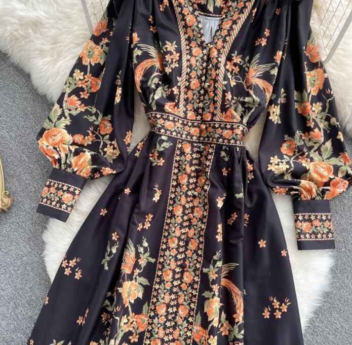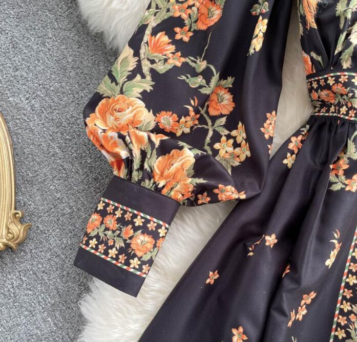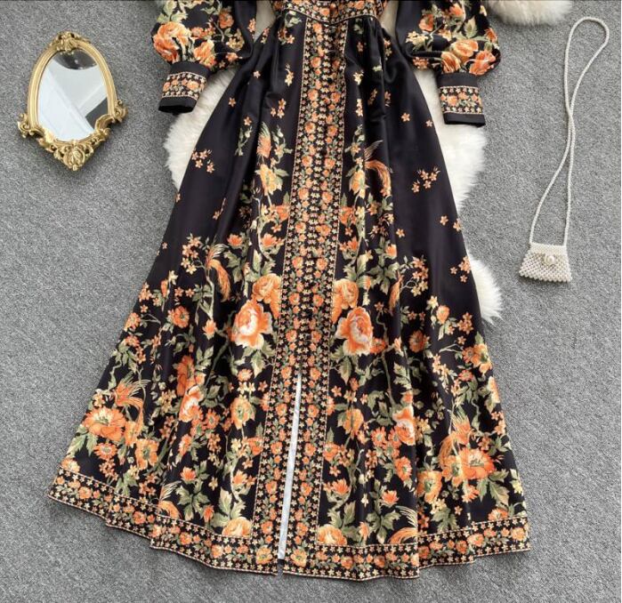 レディース ワンピース ドレス ミモレ ロング 長袖 パフスリーブ バルーン袖 Vネック 襟付き スタンドカラー ビッグカラー フレア Xライン プリーツ ウエストマーク スリット ハイウエスト 異国風 ボタン ギャザー 配色 かわいい 大人可愛い カジュアル おしゃれ レトロ ガーリー 個性的 モダン 主役級 存在感 ヴィンテージ キュート カントリー ロマンティック 花柄 総柄 春 秋 デート お出かけ 公園 女子会 休日 ショッピング M L XL 2XL 大きいサイズ 黒 ベージュ