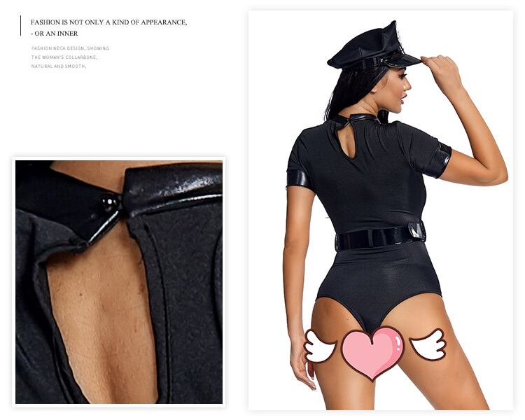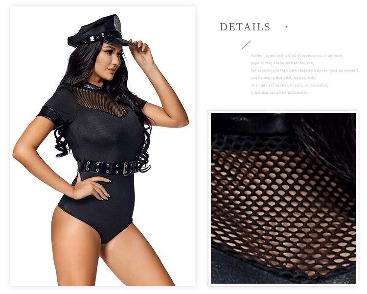 大胆なチーキーさとセクシーな雰囲気を演出する、メッシュのデコルテが印象的な半袖ジャンプスーツ。タイトなシルエットとハイウエスト設計がスタイルアップを叶え、ベルトのウエストマークでメリハリある美シルエットに。伸縮性のあるストレッチ素材で着心地も抜群。帽子・ベルト・警棒がセットになっており、ハロウィンやパーティー、文化祭などのイベントで主役級の存在感を放ちます。