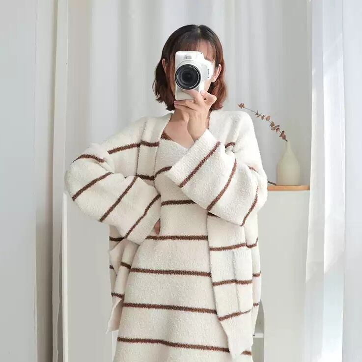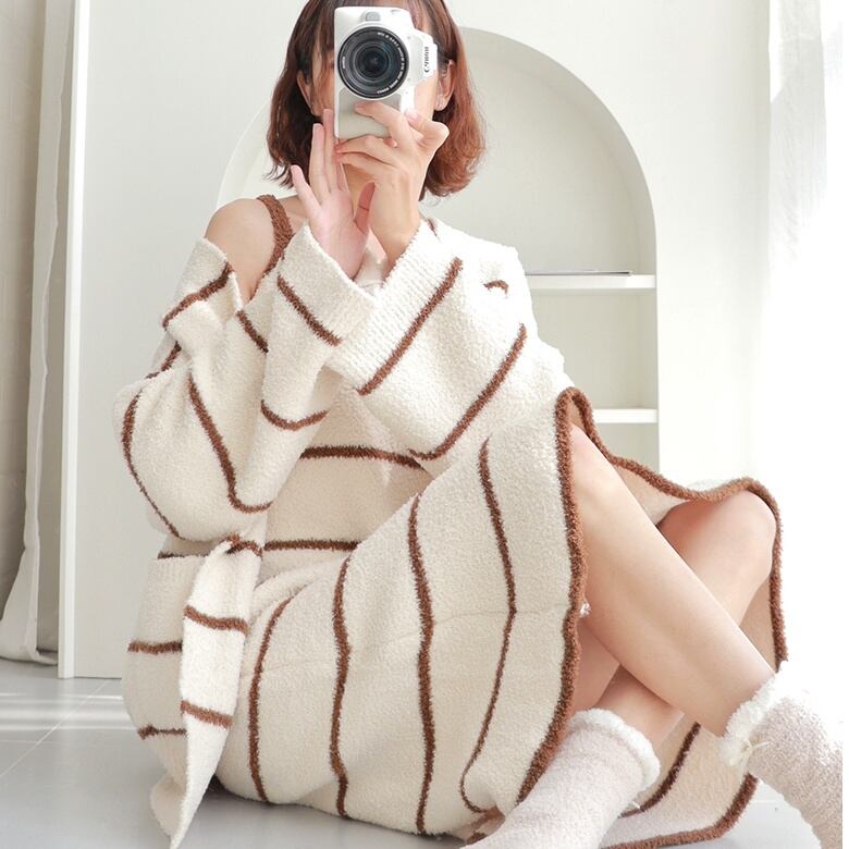 レディース ルームウェア パジャマ 部屋着 前開き 膝下 ミディ 長袖 Vネック もこもこ ふわふわ ふっくら 前開き かわいい 大人可愛い きれいめ シンプル カジュアル おしゃれ レトロ ラフ ルーズ ラブリー キュート ロマンティック ナチュラル 色気 ドーリー 可愛い 清潔感 ボーダー 秋 冬 20代 30代 お泊まり 旅行 休日 韓国 オルチャン コーデ 楽ちん 暖かい 体型カバー 普段使い モテ 清楚 流行 インスタ映え 肌見せ ゆったり ゆる 白 ホワイト 茶色 ブラウン くすみ 大人カラー