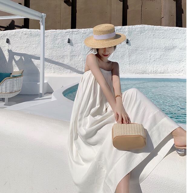 白の無地で清潔感と抜け感をプラスし、夏のデートやビーチ、プール、ホテル滞在にもぴったり。