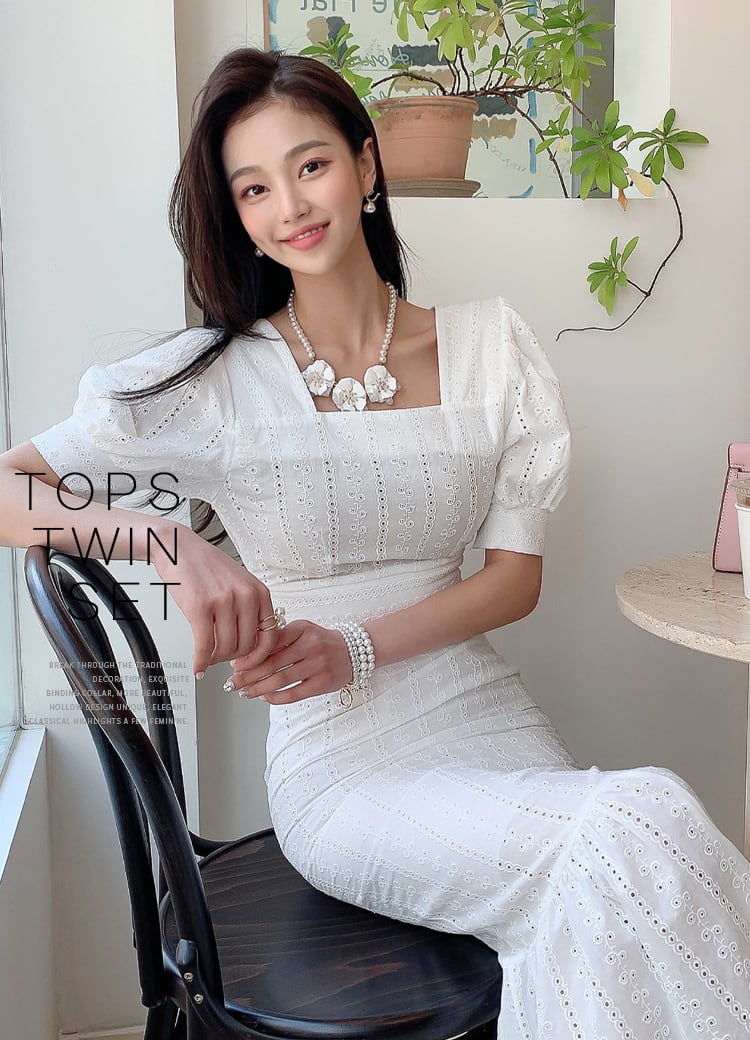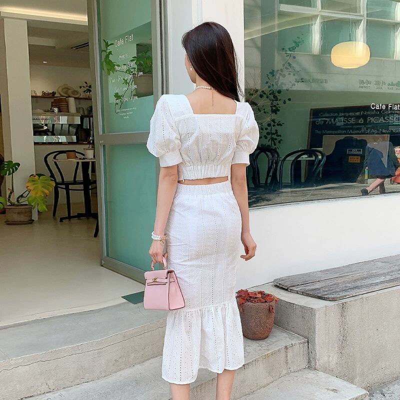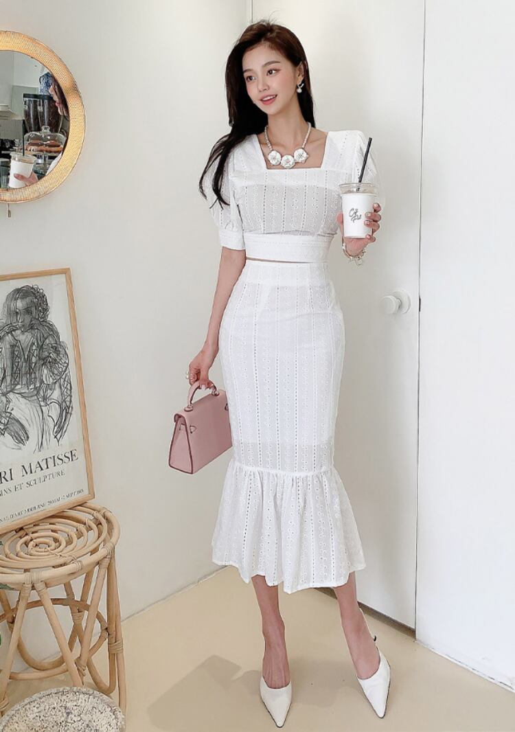レディース セットアップ ツーピース ブラウス マーメイドスカート ミモレ クロップド丈 ミディ 半袖 パフスリーブ スクエアネック タイト スリム フェミニン スレンダー ハイウエスト 透け感 総レース 薄手 かわいい 大人可愛い きれいめ シンプル 上品 おしゃれ ガーリー エレガント ラブリー キュート ロマンティック セクシー 爽やか ドレッシー クリーン センシュアル 花柄 春 夏 デート お出かけ 韓国 普段使い モテ 清楚 トレンド スタイルアップ 肌見せ S M L XL 白 ホワイト