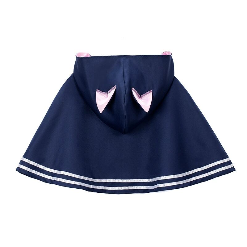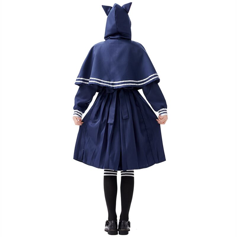 膝丈で程よく落ち着いた印象ながら、プリーツやワイドなAラインが華やかさを演出。ウエストはバックリボンで調整可能だから、ゆったりなのにしっかりスタイルアップ。猫耳ケープ付きで、遊び心も忘れないデザインが魅力です。ネイビー×ホワイトの配色が清潔感とかわいらしさを両立し、ガーリーな気分にぴったりの衣装です。