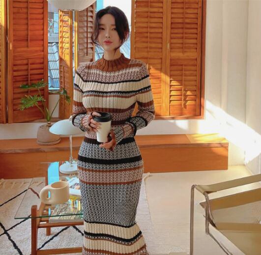 配色ボーダーが視線を引く、秋冬にぴったりの大人可愛いニットワンピース。