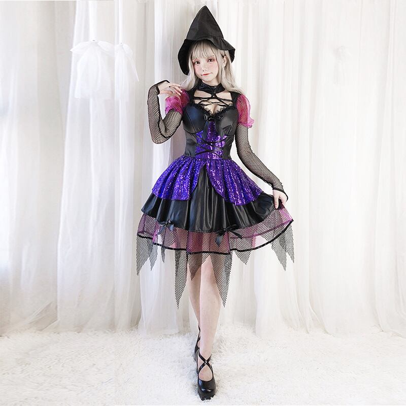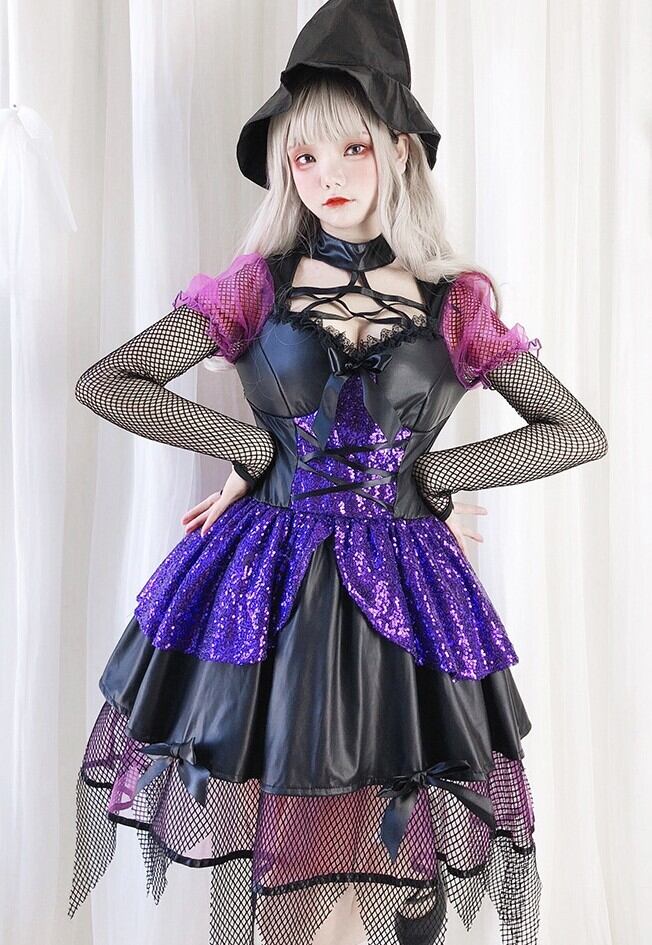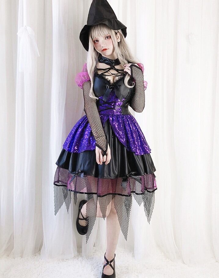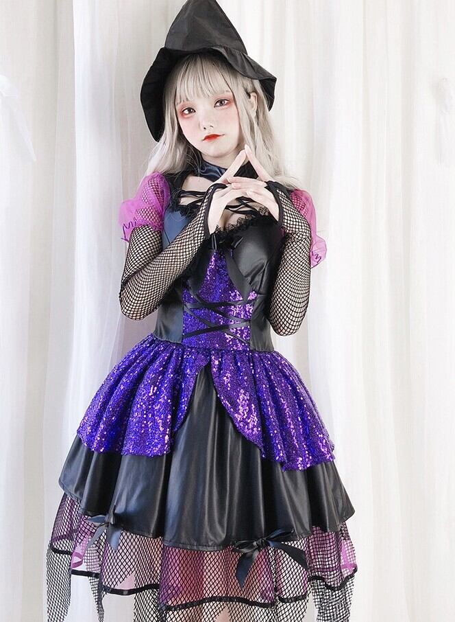 ゴシックとキュートが融合した、魔女風ハロウィンコスチューム。ブラック×パープルの配色とスパンコールのきらめきが華やかさを演出します。個性的なアシンメトリーのスカートと、レースアップデザインの胸元がポイント。網タイツ風の袖や裾も魔女らしいエッジをプラス!