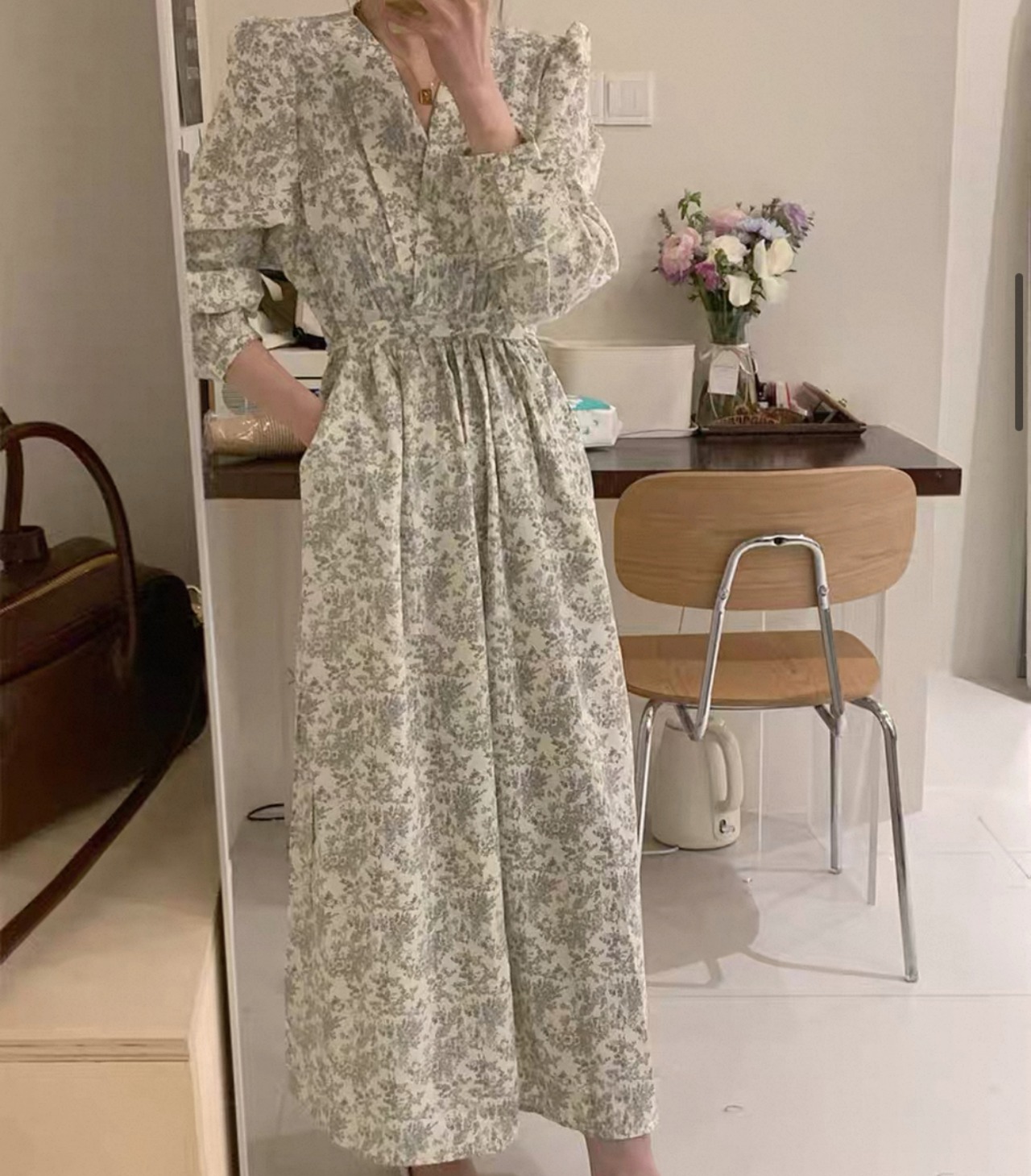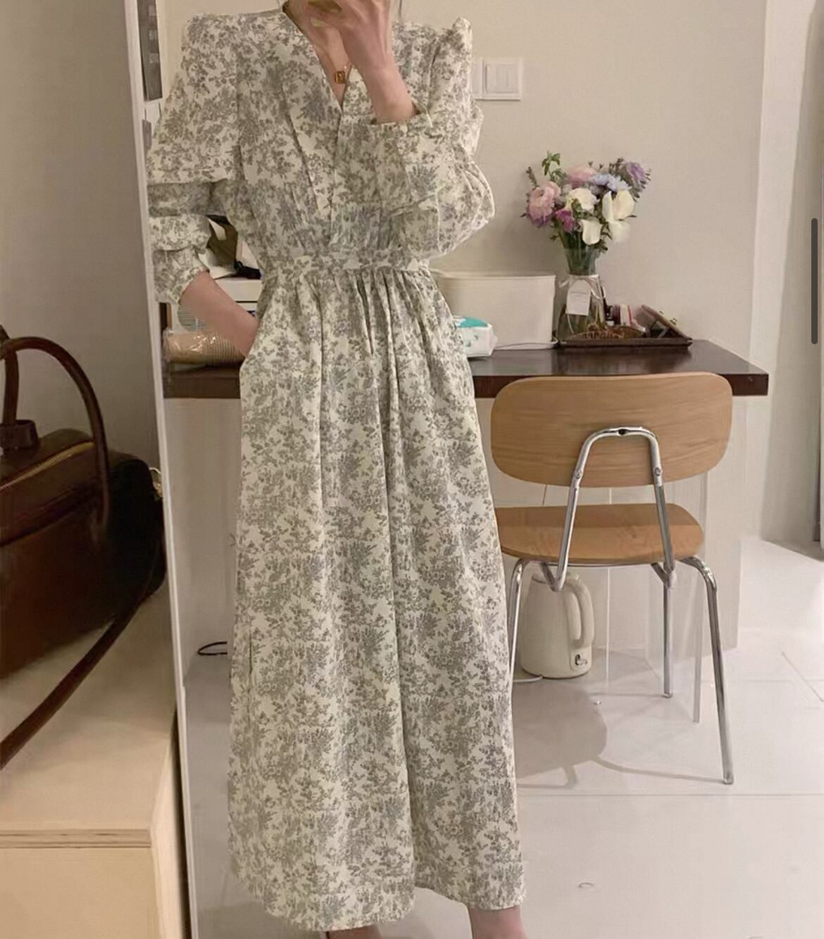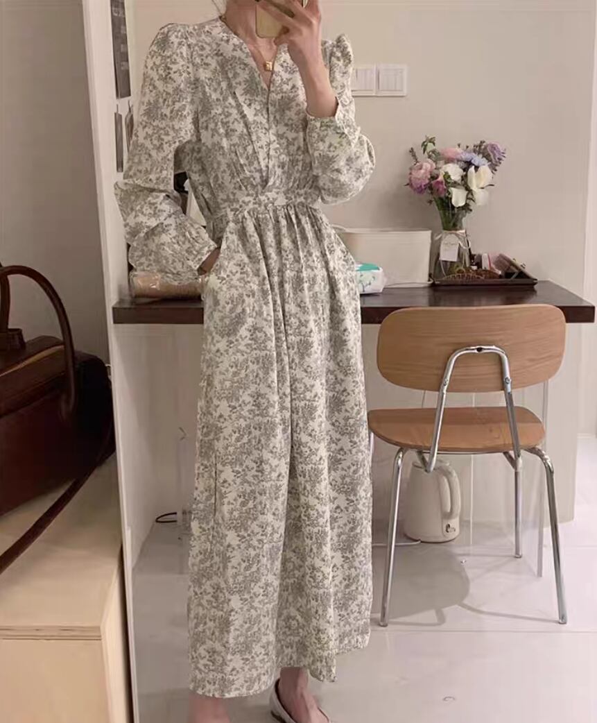ワンピース オールインワン レディース ロング マキシ パフスリーブ ボリュームスリーブ Vネック フェミニン シャーリング ウエストマーク ドロスト 大人可愛い きれいめ シンプル カジュアル 上品 おしゃれ こなれ感 ラフ ガーリー ルーズ モード系 存在感 花柄 プリント 春 秋 冬 ロングシーズン オフィス OL 通勤 デート お出かけ イベント 女子会 休日 ショッピング カフェ ランチ 韓国 オルチャン コーデ 楽ちん 体型カバー 普段使い トレンド スタイルアップ フリーサイズ ライトグレー