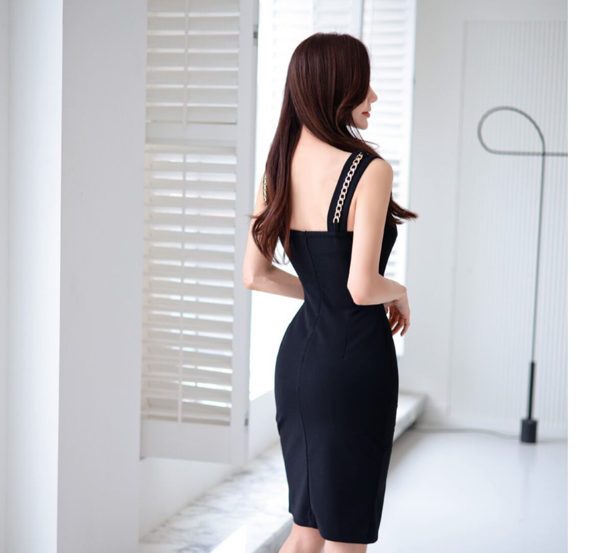 ワンピース ミニドレス タイトワンピース 膝丈 ノースリーブ ゴールドチェーン Vネック タイト スリム 細身 スマート フェミニン フィット サイドスリット 光沢 マット きれいめ シンプル 上品 おしゃれ こなれ感 クール モード系 エレガント 抜け感 都会的 ラグジュアリー セクシー 色気 無地 シーズンレス パーティー イベント レストラン ホテル ラウンジ ディナー ナイトアウト 韓国 オルチャン コーデ 楽ちん 脚長 着回し スタイルアップ 高見え 格上げ S M L XL ブラック