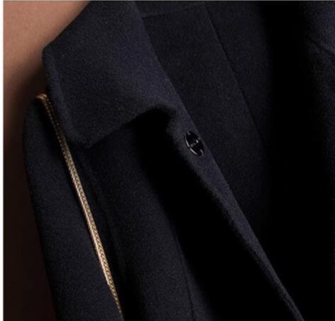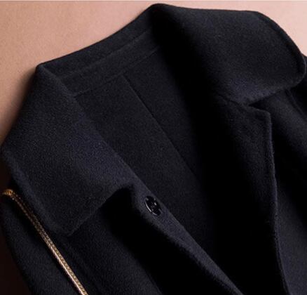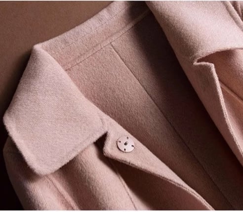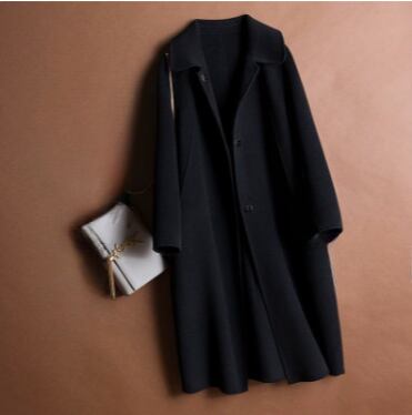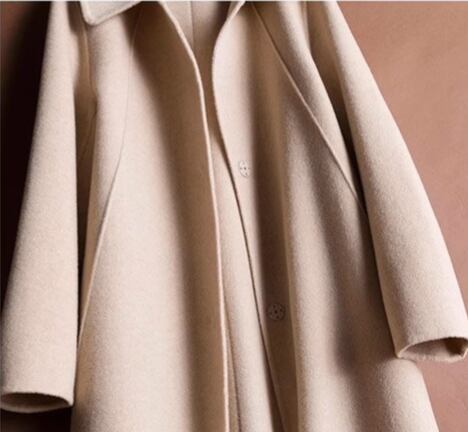 角襟デザインがクラシカルな印象を与える、膝下丈の上品コート。
