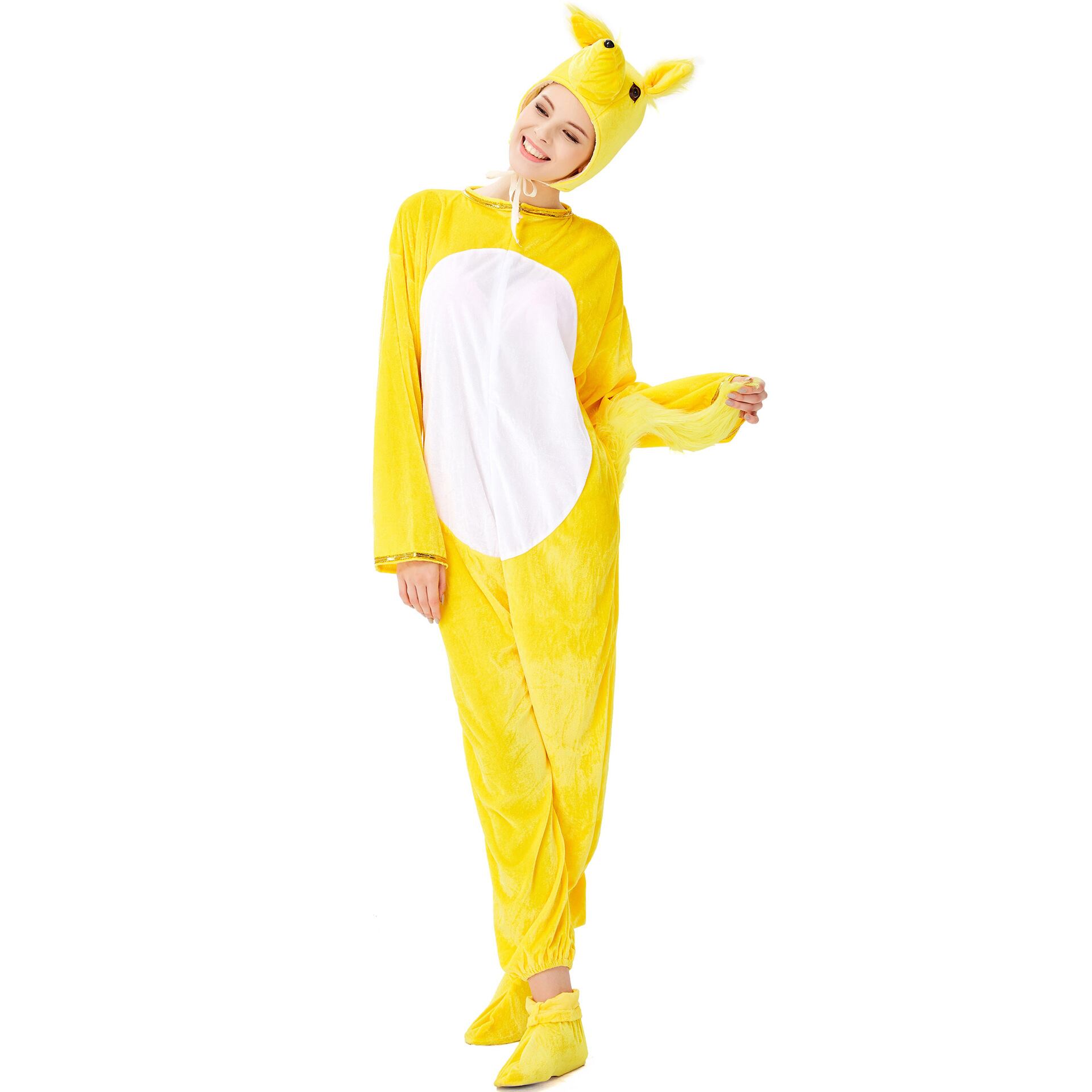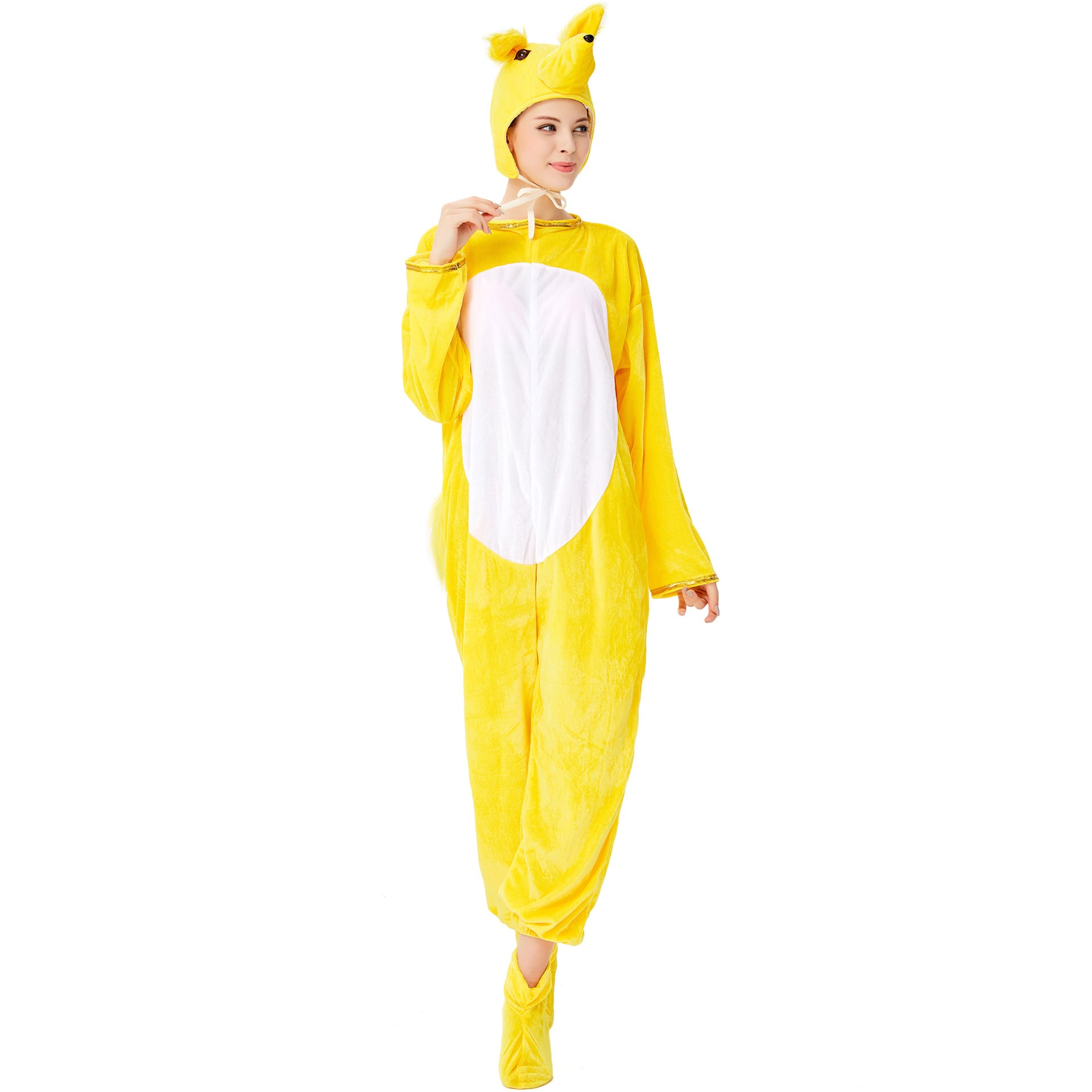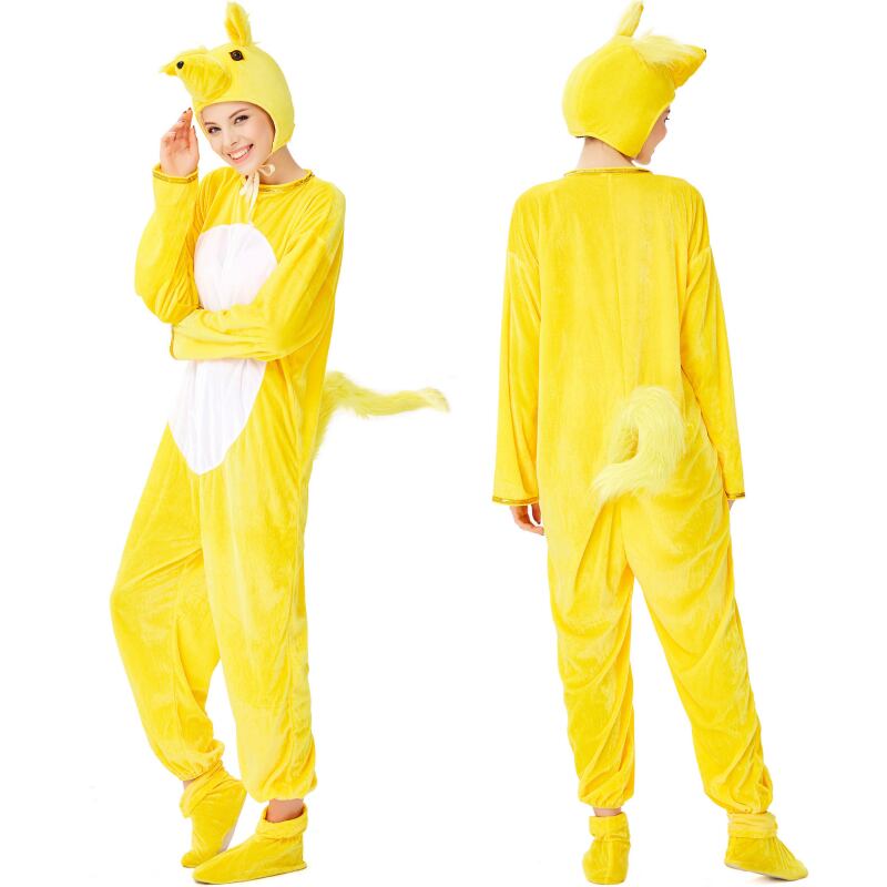 前開きファスナーで着脱が楽ちんなジャンプスーツ型の着ぐるみは、リラックスしながらもキュートさ全開。イエローを基調にしたシンプルで可愛いデザインに、尻尾・帽子・シューズの豪華付属品がついた充実のセットです。ラフでルーズなシルエットは体型カバーにもぴったり。