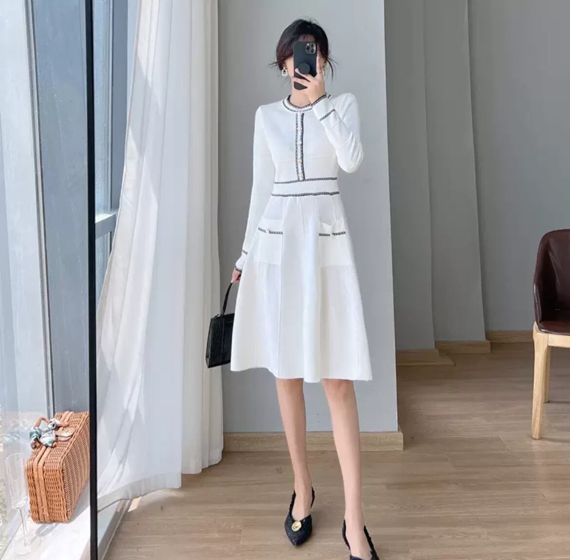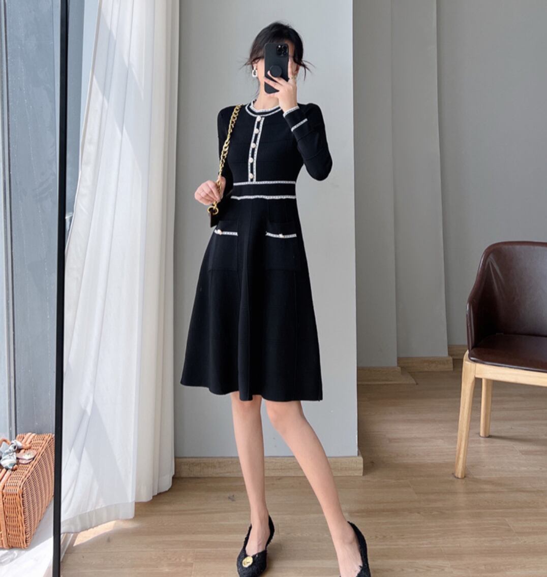 ワンピース オールインワン ニットワンピース レディース 膝丈 長袖 クルーネック スリム 細身 Aライン フェミニン フィット&フレア ウエストマーク パールボタン かわいい 大人可愛い きれいめ 上品 おしゃれ こなれ感 ラフ モード系 存在感 抜け感 清潔感 無地 秋 冬 オフィス OL 通勤 デート お出かけ イベント 女子会 休日 ショッピング カフェ ランチ 韓国 オルチャン コーデ 楽ちん 脚長 普段使い 着回し トレンド スタイルアップ 高見え 格上げ S M L XL ホワイト ブラック