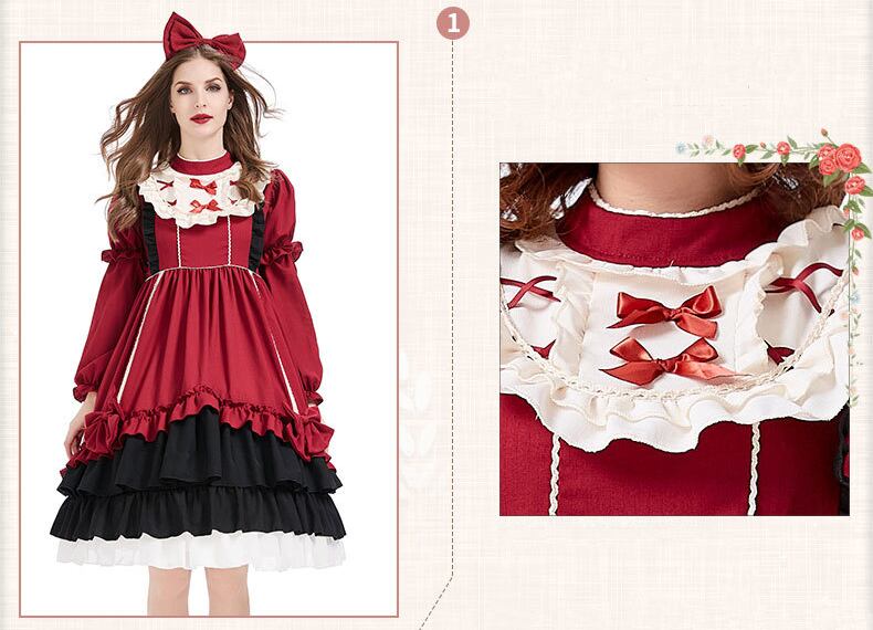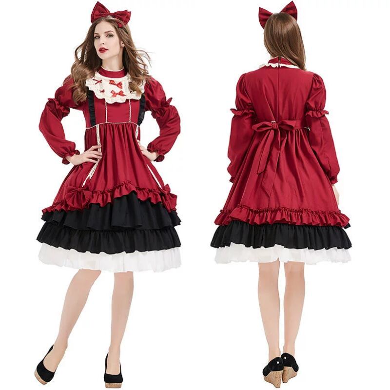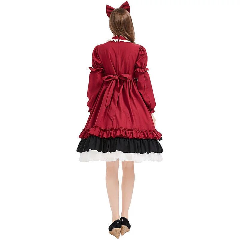 上品なバーガンディカラーが印象的な、膝上丈のフレアAラインドレス。レースとフリルが重なり合い、バックリボンで後ろ姿まで抜かりなく可愛い。パフスリーブの半袖はアームドレスによって長袖スタイルにも変身でき、気候やイベントに合わせて自在にアレンジ可能。ヘッドドレスとアームドレスもセットになっており、ハロウィンや文化祭で主役級の輝きを放てます。