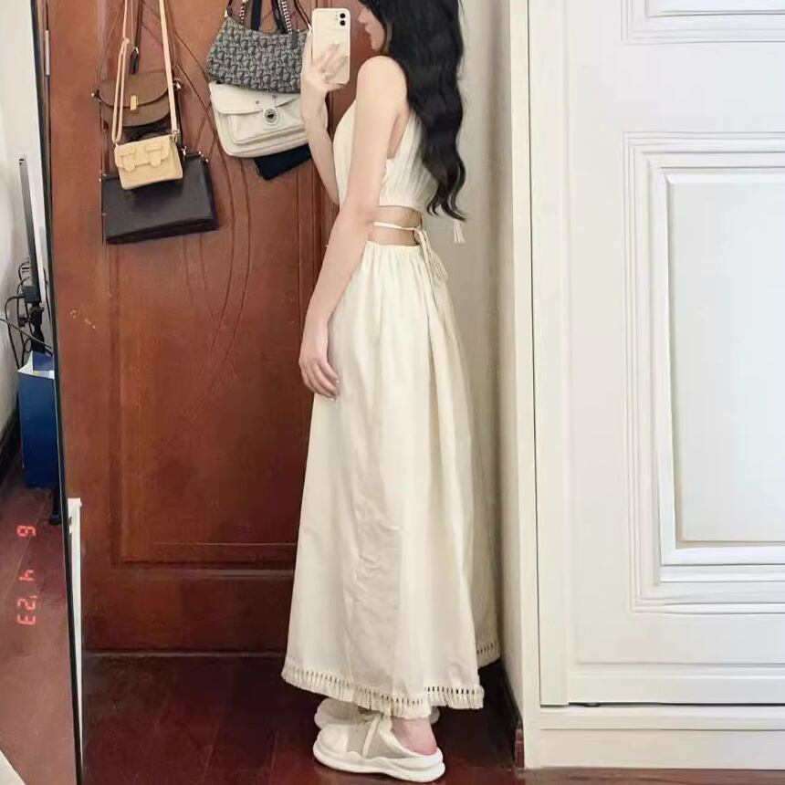 ホルターネックデザインが特徴のこちらのアイテムは、フェミニンでありながらシンプルな美しさを感じさせます。背中が開いたデザインは色気を演出し、大人可愛い印象を与えます。無地のベージュカラーは春夏にぴったりで、リゾートやデート、お出かけシーンにも最適です!爽やかな肌見せで涼しさを感じながら、スタイルアップも実現。インスタ映え間違いなしの一着です!