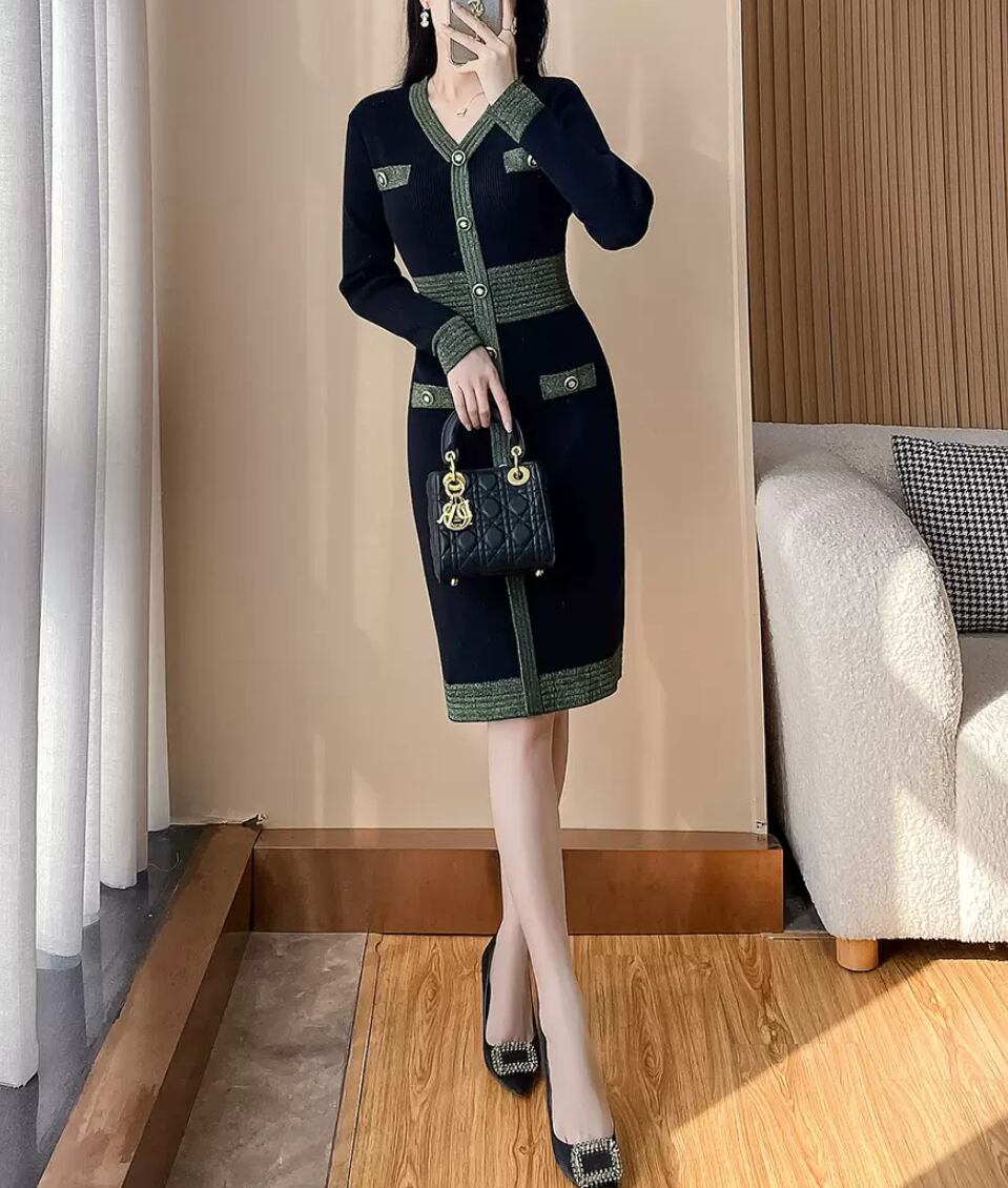 ワンピース オールインワン レディース ニットワンピース ミモレ 長袖 タイト スリム 細身 フェミニン ボタンライン ウエストマーク 伸縮性 バイカラー 配色 フィット 大人可愛い きれいめ 上品 おしゃれ こなれ感 ラフ モード系 抜け感 セクシー 色気 セミフォーマル 無地 秋 冬 オフィス OL 通勤 デート お出かけ イベント 女子会 休日 ショッピング カフェ ランチ 韓国 オルチャン コーデ 楽ちん 体型カバー 普段使い 着回し スタイルアップ 高見え 格上げ S M L XL ブラック