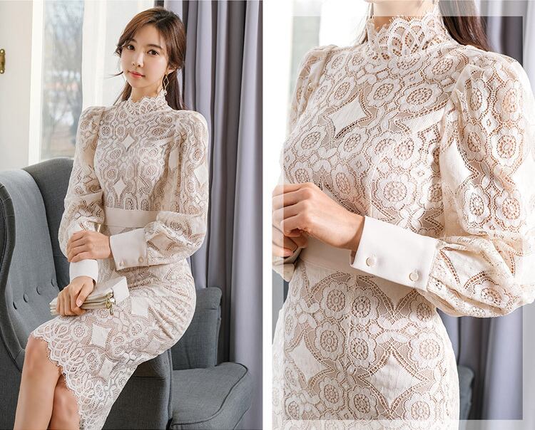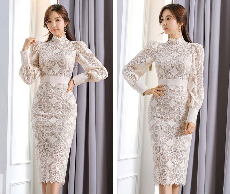 レディース ワンピース ドレス 膝丈 ミディ 長袖 パフスリーブ ハイネック モックネック ボトルネック タイト スリム 細身 フェミニン ボディコンシャス アワーグラスライン ウエストマーク ハイウエスト 透け感 総レース 大人可愛い きれいめ シンプル 上品 エレガント キュート 都会的 シック 華やか ドレッシー センシュアル 花柄 フラワー 春 秋 謝恩会 二次会 披露宴 お呼ばれ デート お出かけ パーティー レストラン ホテル 普段使い トレンド スタイルアップ S M L XL オフホワイト