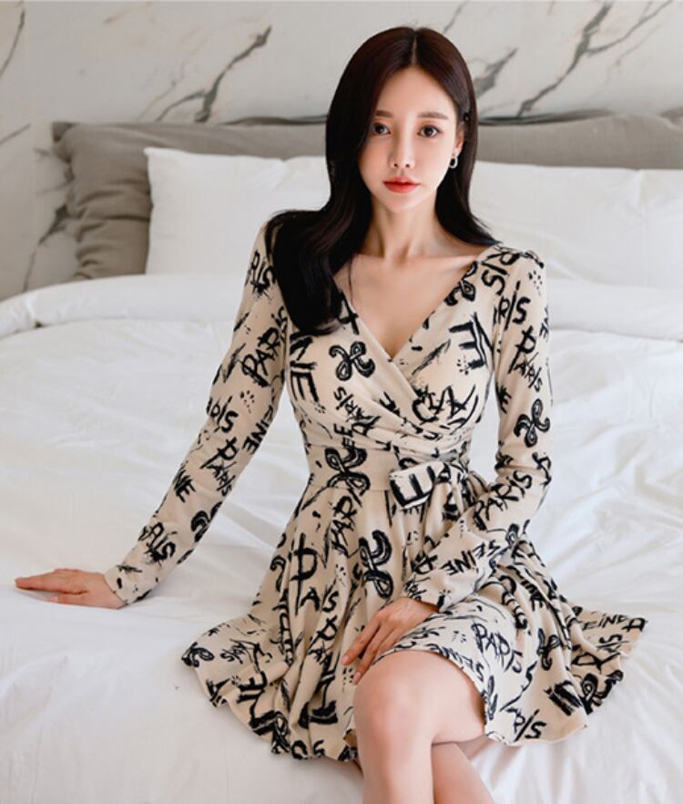 レディース ワンピース ミニ ショート 長袖 Vネック フレア Aライン Xライン Vバック ウエストリボン ハイウエスト かわいい カジュアル おしゃれ ガーリー 個性的 存在感 ラブリー キュート 都会的 セクシー シック 華やか ドレッシー 可愛い センシュアル プリント ロゴ 春 秋 デート お出かけ 休日 合コン コンパ キャバ ラウンジ 韓国 オルチャン 普段使い モテ トレンド インスタ映え スタイルアップ 肌見せ S M L XL ブラック オフホワイト バイカラー マルチカラー