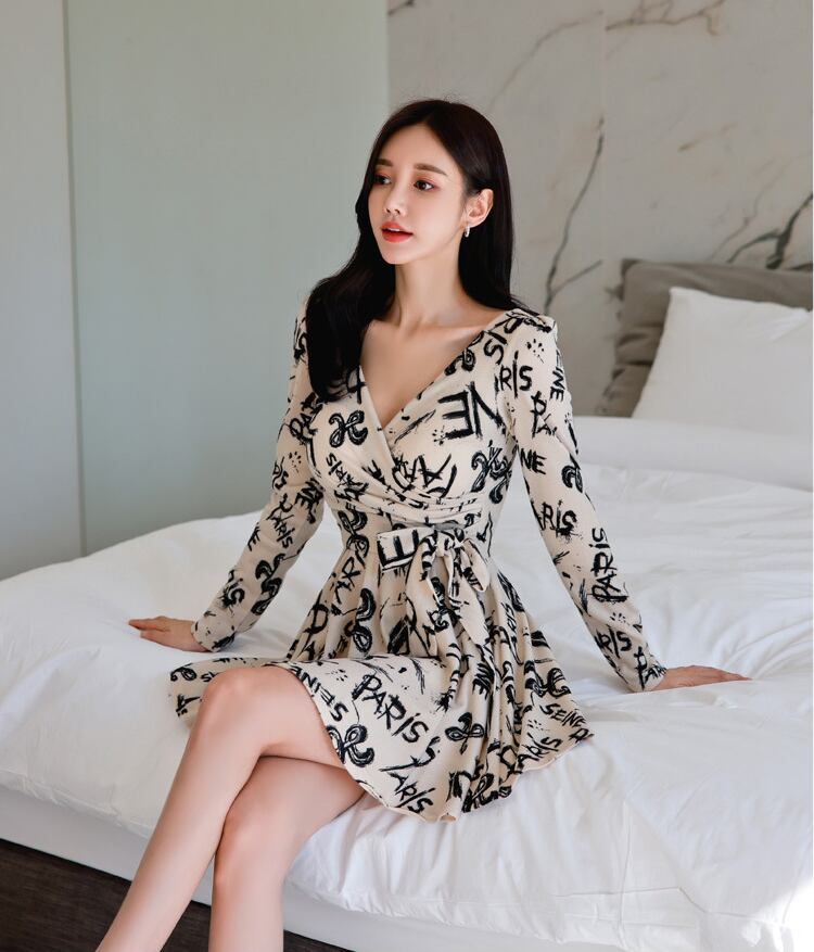 淡いアプリコットカラーに大胆なブラックのロゴプリントが施され、個性的でおしゃれな印象に。VネックとVバックがセンシュアルな魅力を引き立て、フレアなXラインがキュートな動きを演出します。ハイウエストのウエストリボンがスタイルアップを叶え、春や秋の普段使いやデート、お出かけにも活躍。華やかで存在感のある一枚で、あなたらしさを表現してみませんか。