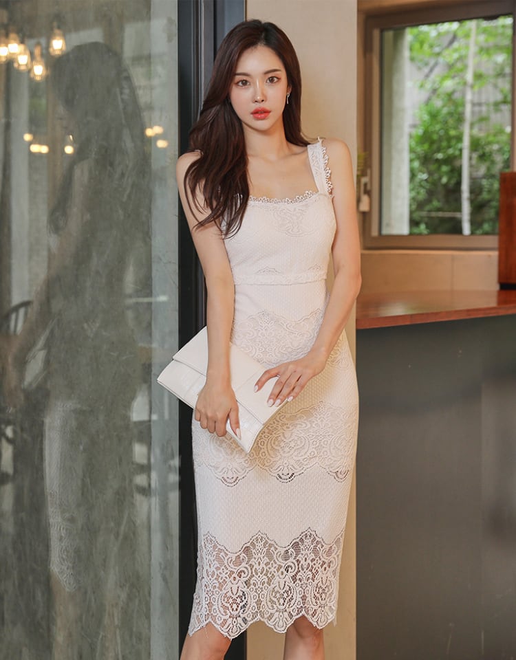 レディース ワンピース ドレス 膝丈 ミディ 袖なし ノースリーブ スクエアネック タイト スリム 細身 フェミニン スキニー ボディコンシャス アワーグラスライン 透け感 総レース かわいい 大人可愛い きれいめ 上品 エキゾチック エレガント キュート 都会的 セクシー 色気 シック ノーブル クリーン センシュアル 花柄 フラワー 春 夏 謝恩会 二次会 お呼ばれ デート お出かけ パーティー ホテル キャバ ラウンジ 韓国 オルチャン モテ トレンド 肌見せ S M L XL 白 ホワイト