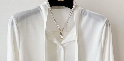 ボウタイ付きのシフォンブラウスのセットアップです。