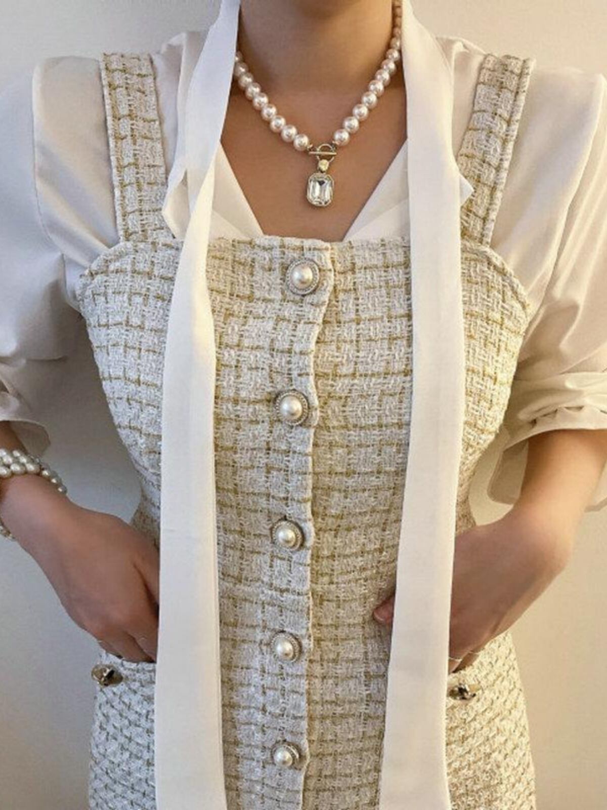 クラシカルで上品な雰囲気を演出する、ツイードのサスペンダースカートと、