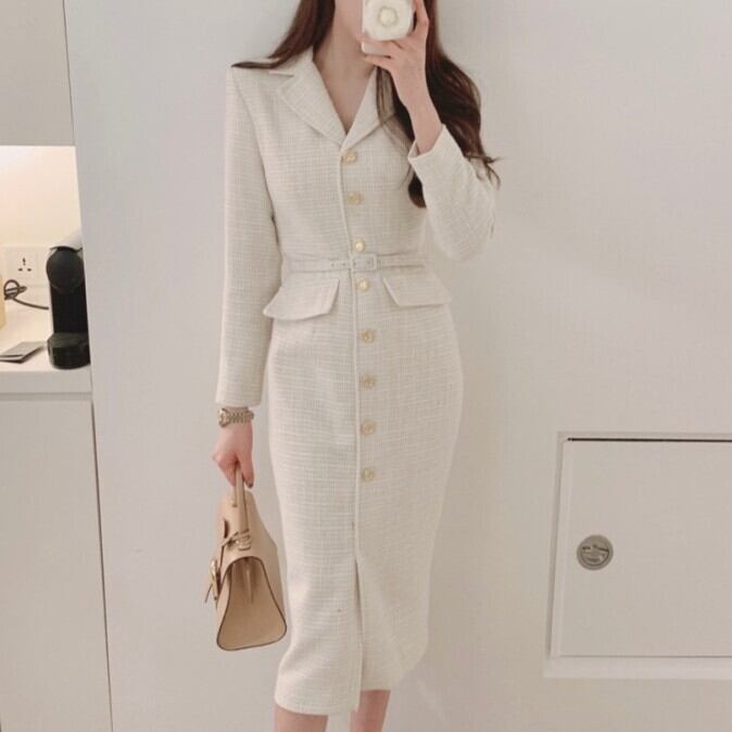 レディース ワンピース ミディ 長袖 テーラードカラー Iライン ベルト ボタン ツイード ポリエステル きれいめ シンプル 上品 レトロ アジアン 個性的 モード系 エレガント 主役級 存在感 フォーマル 都会的 ナチュラル 華やか 清潔感 繊細 クラシカル 無地 冠婚葬祭 会議 MTG 同窓会 お呼ばれ セレモニー ママ 30代 40代 50代 オフィス ビジネス OL 通勤 デート お出かけ パーティー イベント レストラン 女子会 コンパ クラブ キャバ ラウンジ 高見え S M L ホワイト