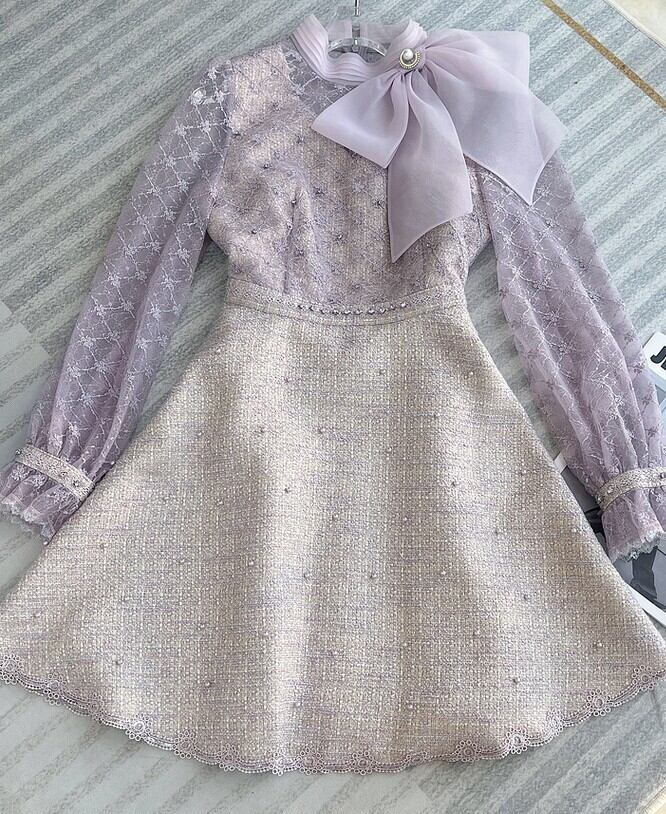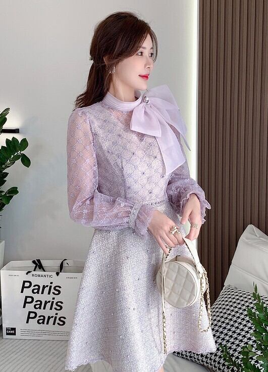 レディース ワンピース 膝丈 長袖 スタンドカラー フレア レース リボン ボタン パール きれいめ シンプル 上品 レトロ アジアン 個性的 モード系 エレガント 主役級 存在感 フォーマル 都会的 ナチュラル 華やか 清潔感 繊細 クラシカル 無地 冠婚葬祭 会議 MTG 演奏会 同窓会 お呼ばれ セレモニー ママ 30代 40代 50代 オフィス ビジネス OL 通勤 デート お出かけ パーティー イベント レストラン 女子会 コンパ クラブ キャバ ラウンジ 高見え S M L ライトパープル