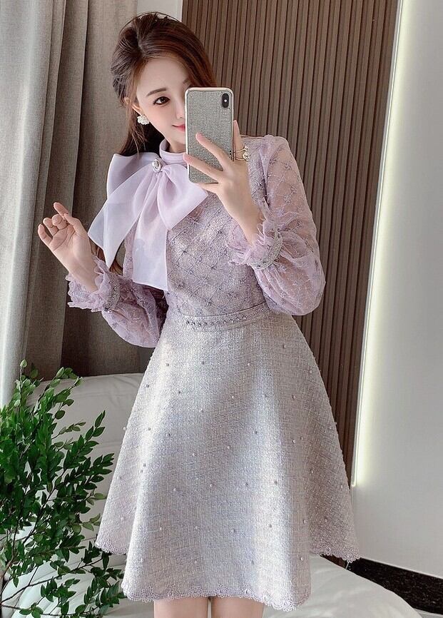 スカート部分は高級感のあるツイード生地で、程よいフレアシルエットが美しいラインを演出。デートや特別なお出かけ、パーティーシーンにもぴったりな一着です。