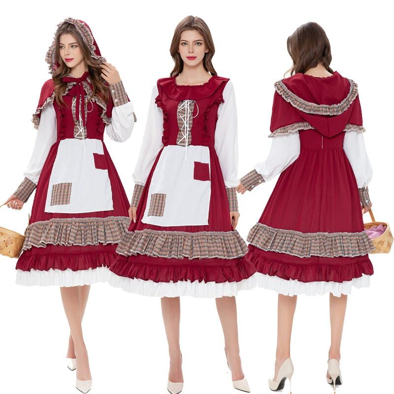 レディース ワンピース ケープ セットアップ 膝丈 膝下 ミディ 長袖 パフスリーブ ラウンドネック フレア Aライン フリル ハイウエスト 異国風 かわいい 上品 レトロ ガーリー 主役級 存在感 ラブリー キュート カントリー ロマンティック 華やか ドーリー 可愛い クラシカル チェック 格子柄 春 秋 冬 ハロウィン 文化祭 学園祭 大人用 パーティー イベント 発表会 コスプレ 演劇 舞台 ステージ パフォーマンス 体型カバー コスチューム 衣装 仮装 赤ずきん 童話 S M L XL レッド