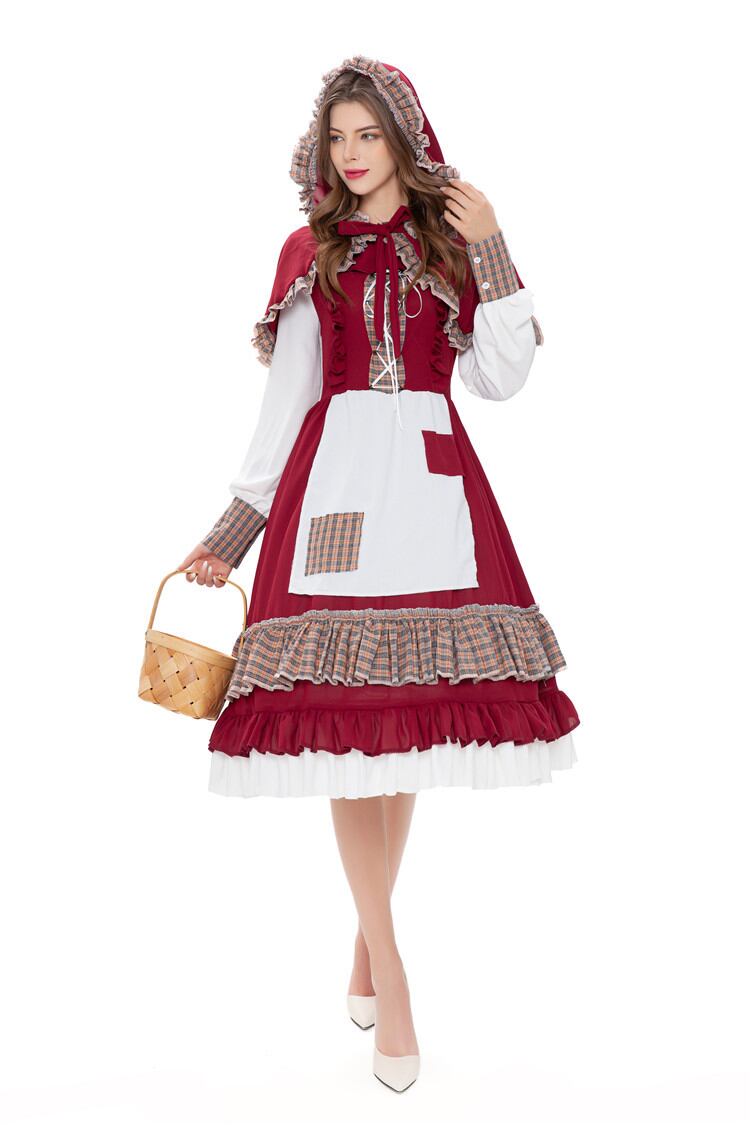 異国風のレトロな雰囲気漂う、赤ずきんをイメージしたコスチュームセット。ミディ丈のAラインワンピースは、たっぷりのフリルとパフスリーブがロマンティックな印象を演出。ハイウエストで体型カバーも叶い、チェック柄がクラシカルな可愛さを引き立てます。ケープ付きで存在感も抜群。ハロウィンや文化祭、学園祭、演劇や舞台などのステージ衣装としてもおすすめ。大人のためのラブリーでキュートな仮装スタイルです。