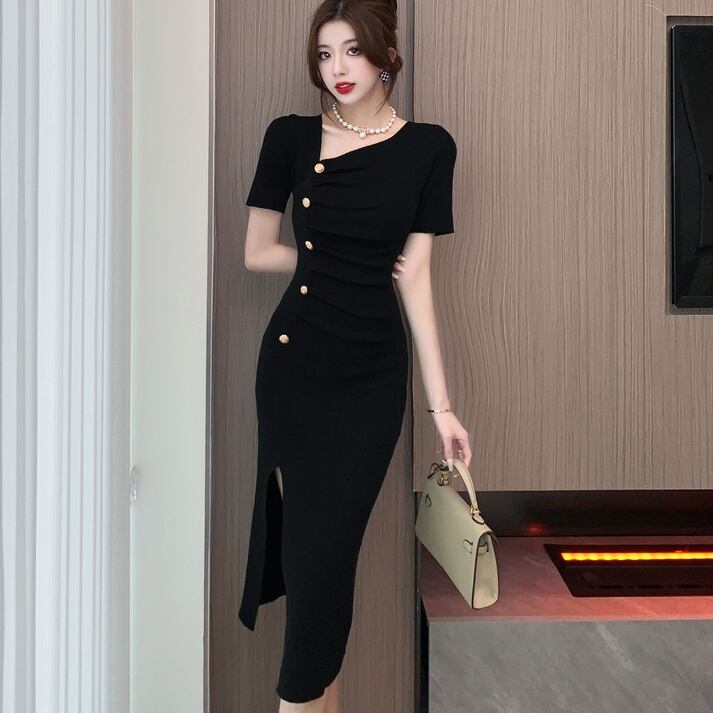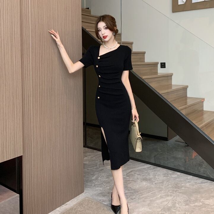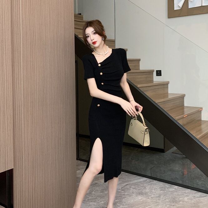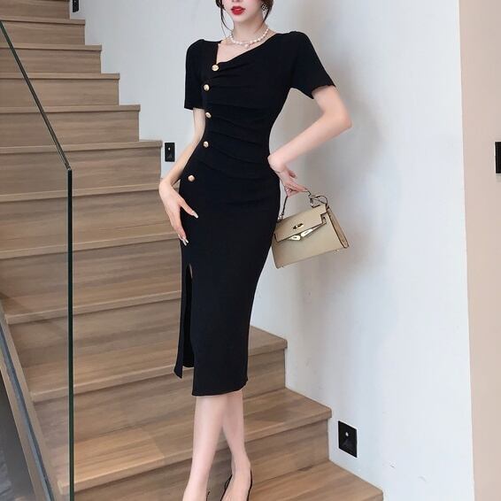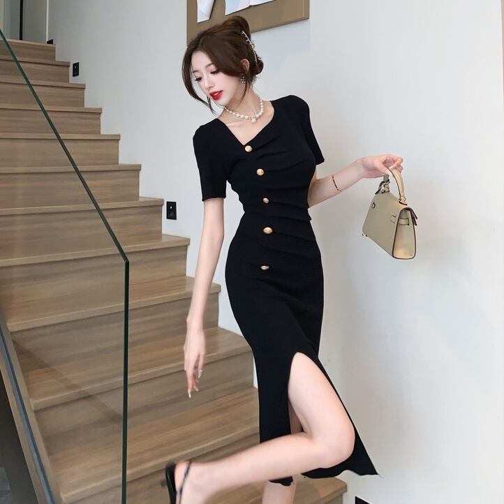 レディース ワンピース ドレス 膝丈 Vネック スリム スレンダー サイドスリット かわいい 大人可愛い きれいめ シンプル 上品 おしゃれ こなれ感 エレガント モダン 主役級 フォーマル 都会的 ラグジュアリー ロマンティック セクシー 色気 華やか 無地 春 夏 お呼ばれ 20代 デート お出かけ パーティー イベント レストラン 女子会 ホテル ショッピング ラウンジ 韓国 オルチャン コーデ 美脚 モテ 清楚 インスタ映え スタイルアップ S M L 黒 ブラック ベーシックカラー 大人カラー