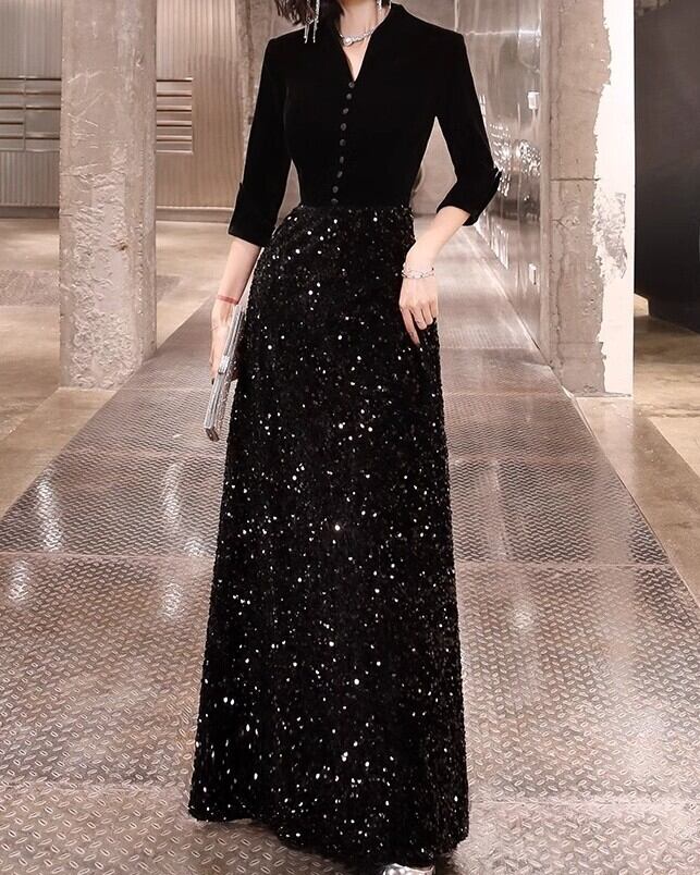 ドレス ワンピース カラードレス ウェディング パーティー 結婚式 二次会 披露宴 演奏会 発表会 ステージ 舞台 フォーマル キャバ 衣装 謝恩会 ラウンジ クラブ お色直し イブニング ロング マキシ 7分袖 Vネック スタンドカラー 細身 ベルベット スパンコール 上品 おしゃれ アジアン エレガント 主役級 存在感 フォーマル ゴージャス 無地 パーティー イベント レストラン 体型カバー 美脚 脚長 格上げ 光沢感 スタイルアップ シーズンレス XS 2XL 3XL S M L XL ブラック