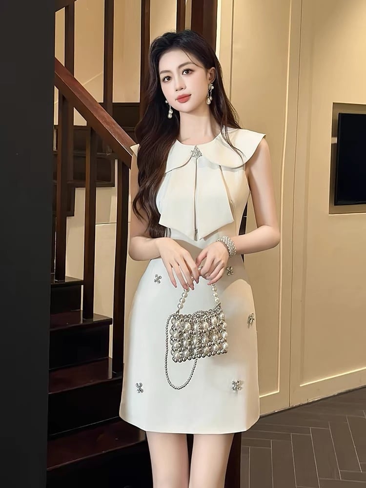 レディース ワンピース ドレス ミニ ショート ノースリーブ ラウンドネック 丸襟 Aライン フェミニン スレンダー リボン ビジュー かわいい きれいめ シンプル 上品 ガーリー エレガント モダン ラブリー キュート 都会的 ラグジュアリー ロマンティック シック ノーブル 華やか ゴージャス ドレッシー 可愛い クリーン リュクス 春 夏 結婚式 二次会 披露宴 お呼ばれ 10代 20代 パーティー レストラン ホテル 韓国 オルチャン モテ 清楚 トレンド 高見え 格上げ S M L オフホワイト
