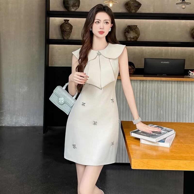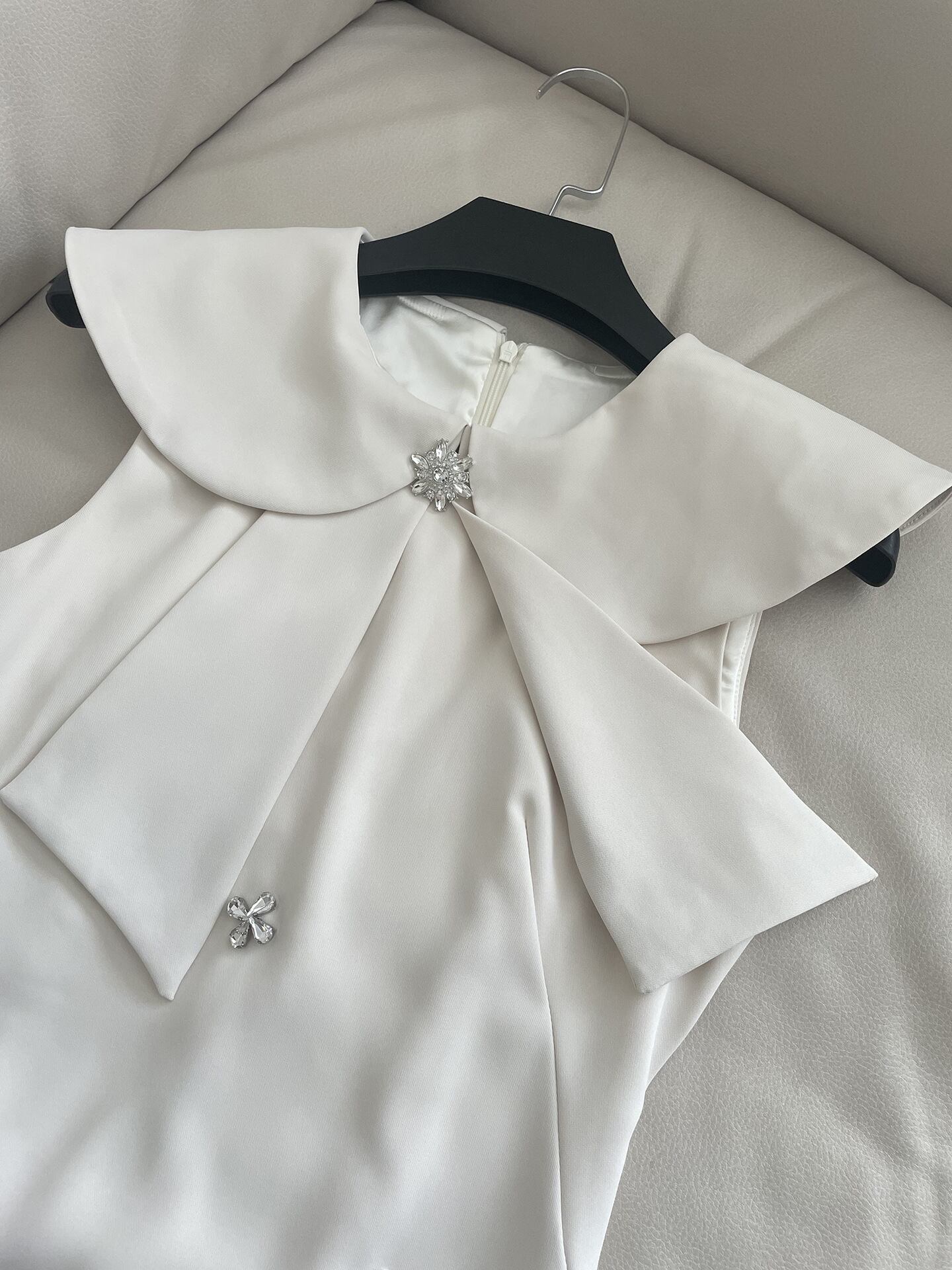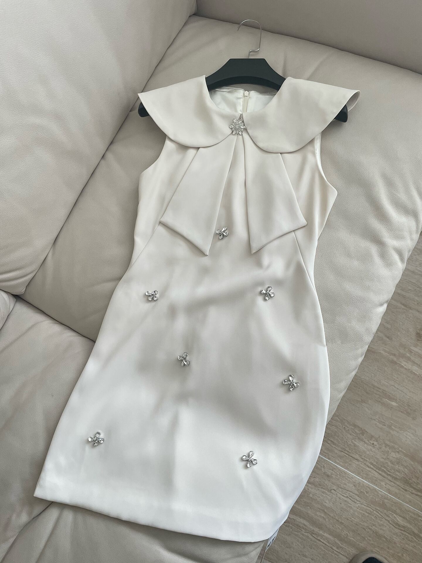 大きめの丸襟とリボンタイが清楚で可愛らしい印象を与える、ノースリーブのミニワンピース。シンプルなデザインながら、花型のビジューがドレスに煌びやかな華やかさを添えます。スレンダーなAラインシルエットがスタイルアップを叶え、きれいめで上品な雰囲気に。オフホワイトのカラーがクリーンでリュクスな印象を演出し、春夏のお呼ばれやパーティー、ホテルやレストランでのシーンにぴったりな、モテ感あふれる一着です。