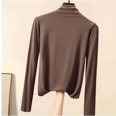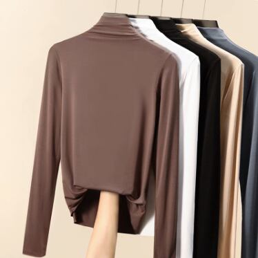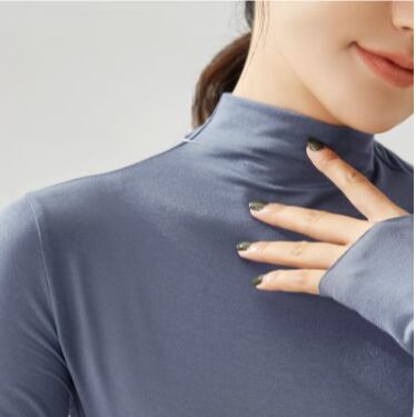 柔らかく伸縮性のある生地が身体にほどよくフィットする、長袖ハイネックトップス。