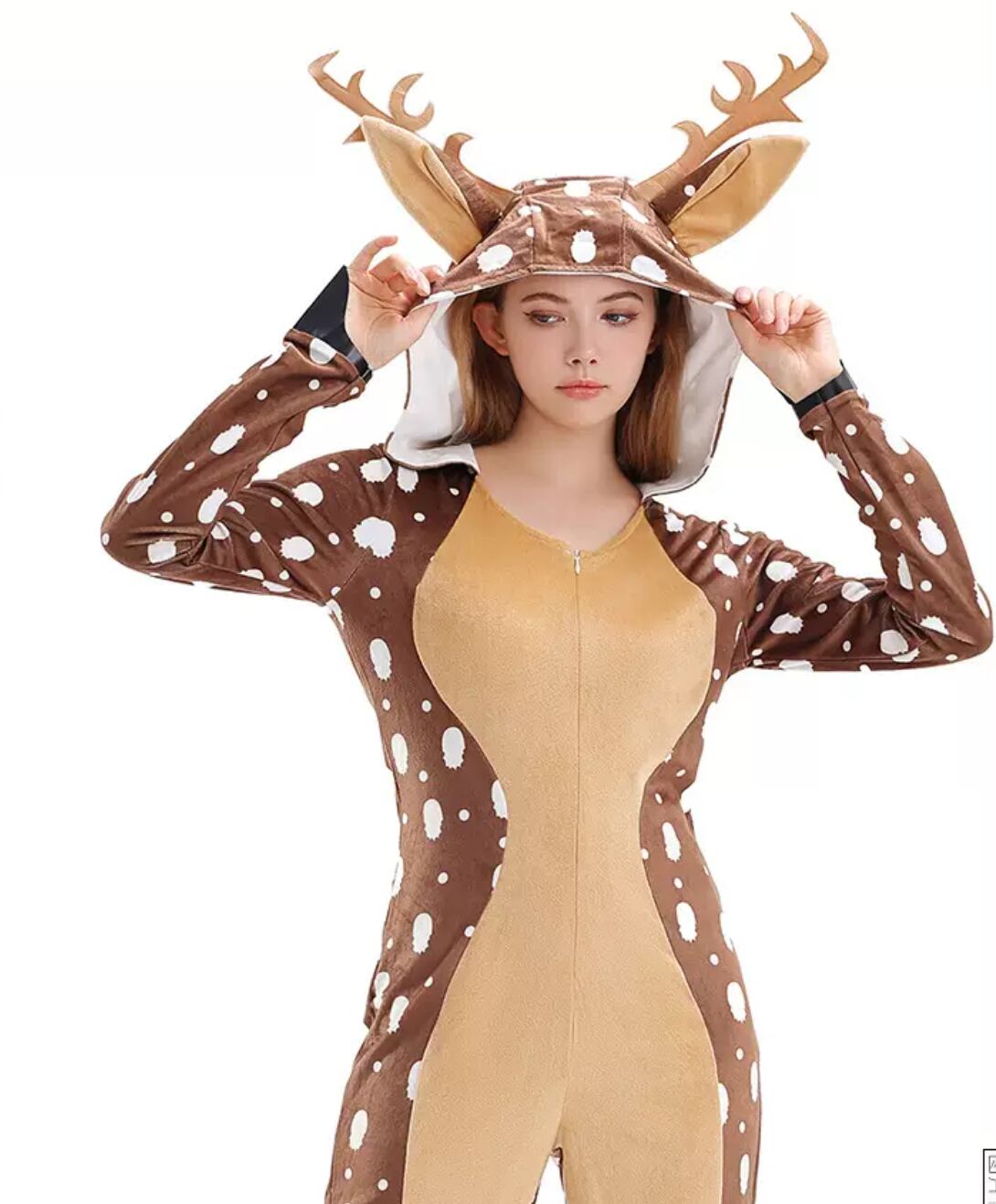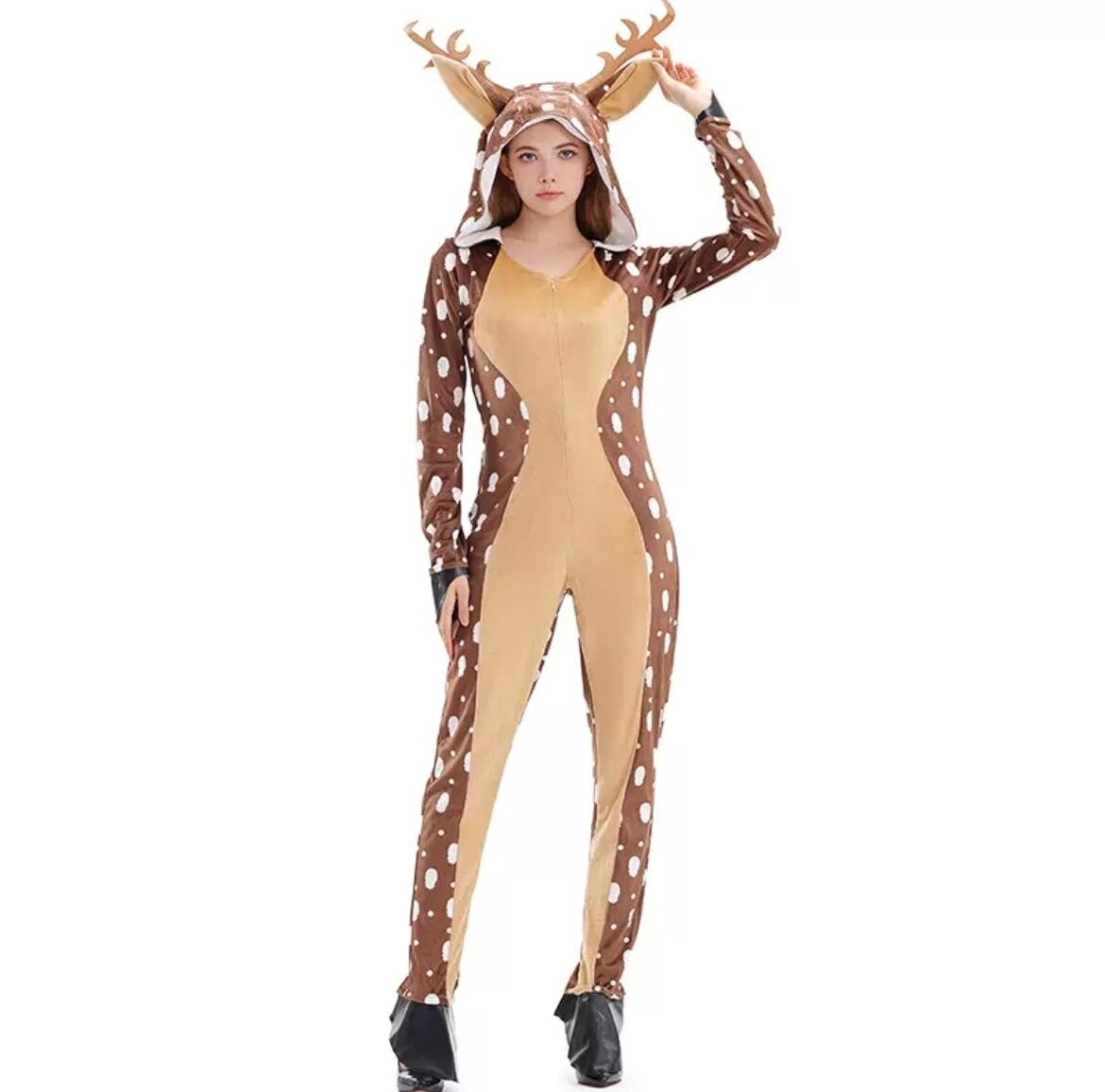着ぐるみ ジャンプスーツ レディース 部屋着 パジャマ コスプレ つなぎ パーカー プレイスーツ アンクル丈 長袖 フード トナカイ ツノ 耳 カジュアル おしゃれ ラフ 個性的 主役級 存在感 抜け感 アクティブ アニマル柄 ツートーン 斑点模様 秋 冬 ハロウィン クリスマス 文化祭 学園祭 ユニセックス パーティー イベント ライブ ステージ パフォーマンス 写真撮影 韓国 オルチャン コーデ 暖かい 体型カバー インスタ映え コスチューム 衣装 仮装 S M L ゆったり ブラウン