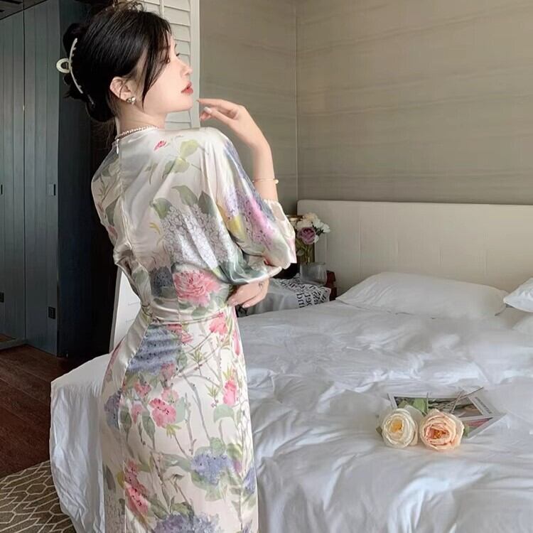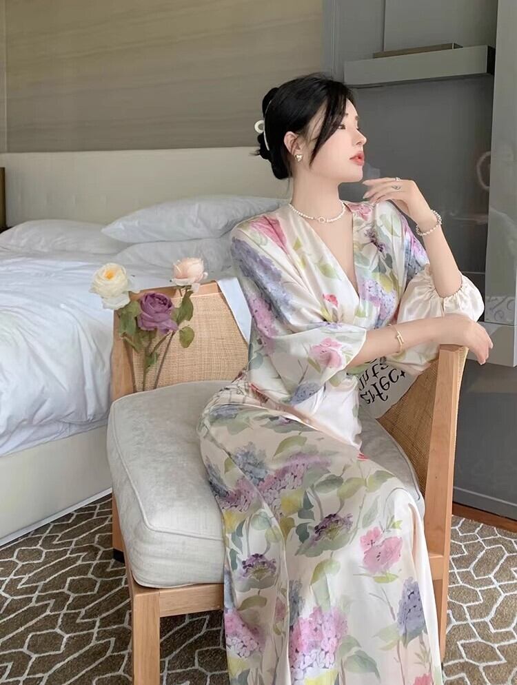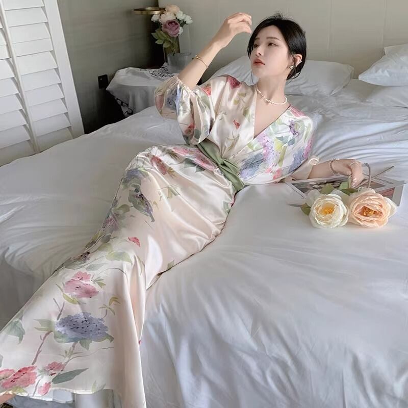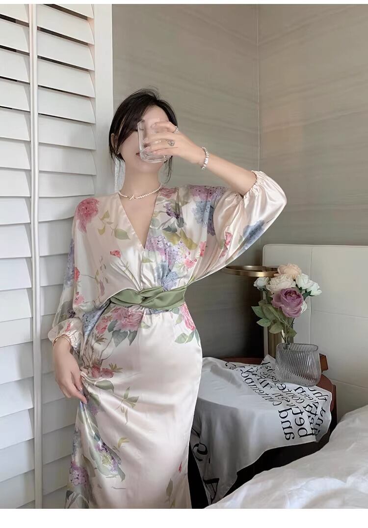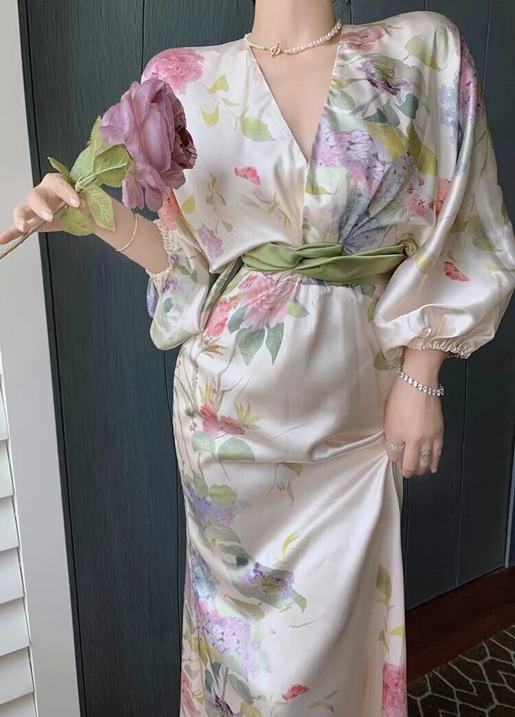 レディース ワンピース ロング 7分袖 Vネック タイト スリム 細身 ウエストマーク かわいい 大人可愛い きれいめ シンプル カジュアル 上品 おしゃれ かっこいい レトロ アジアン エスニック エキゾチック こなれ感 ラフ 個性的 クール モード系 エレガント とろみ感 抜け感 ナチュラル ワイルド セクシー 色気 爽やか 華やか 可愛い 清潔感 花柄 夏 お泊まり リゾート 旅行 女子会 休日 バカンス ホテル 楽ちん 体型カバー 普段使い モテ 清楚 リラックス S M L XL 大人カラー