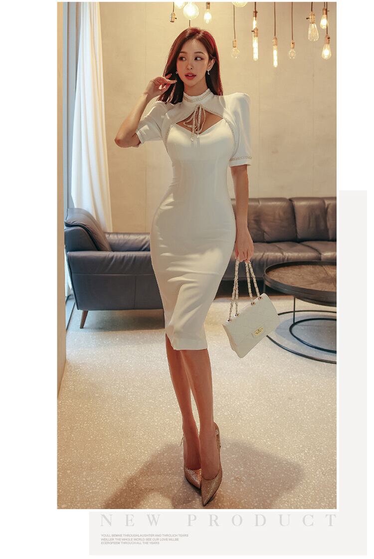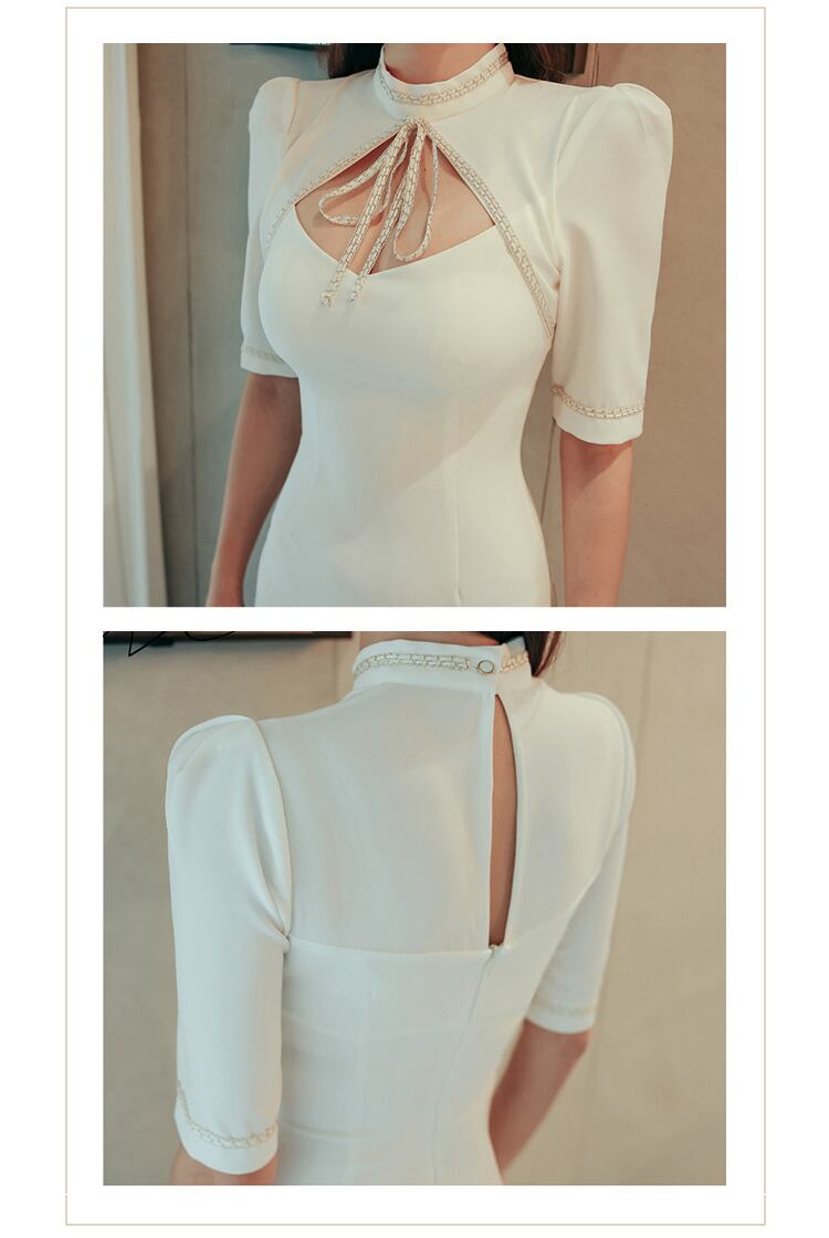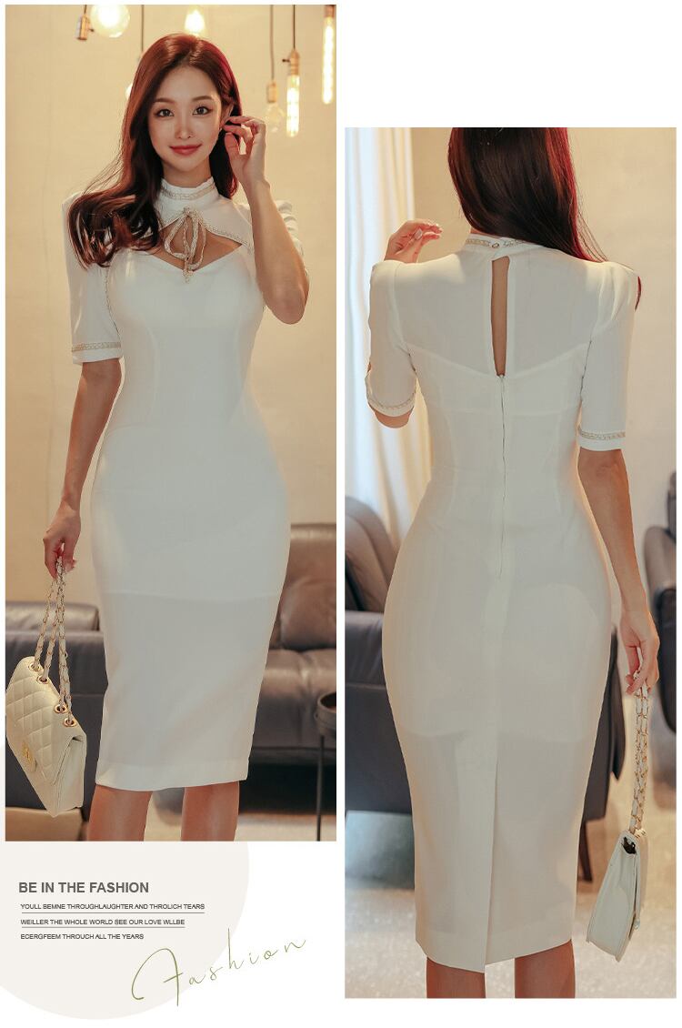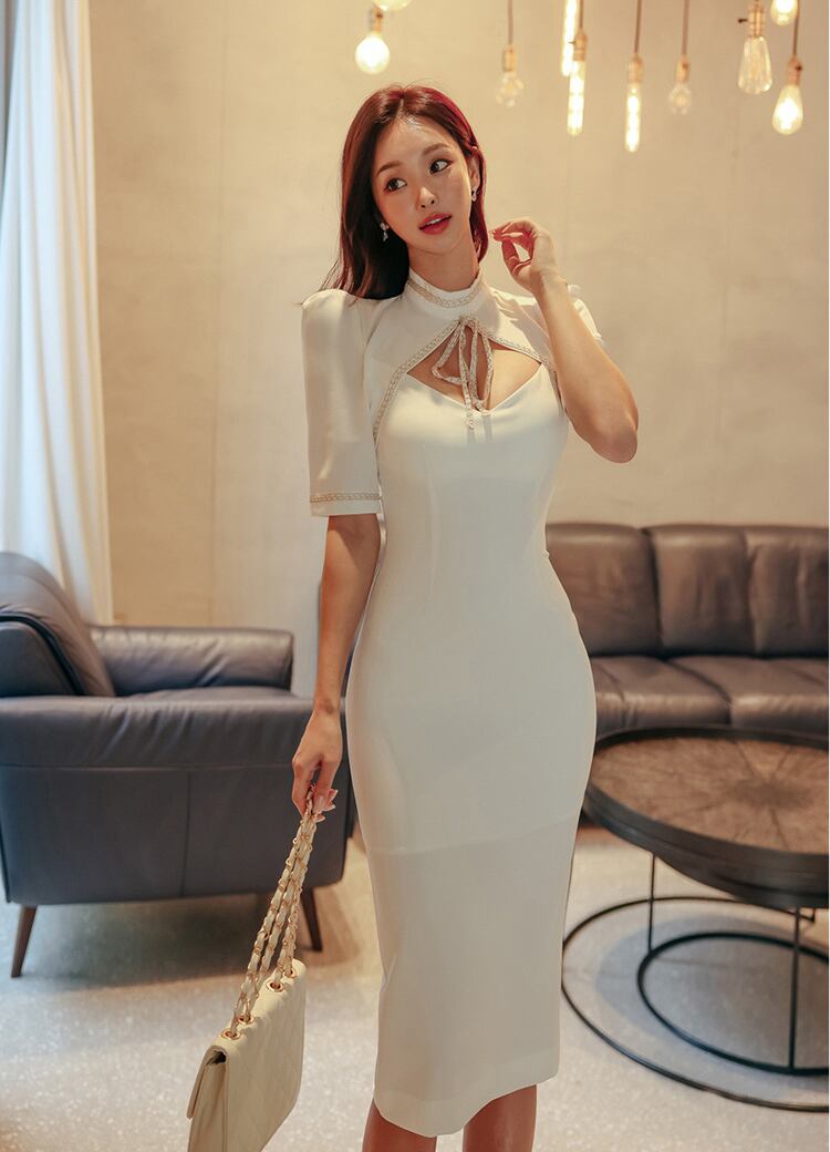 レディース ワンピース ドレス 膝丈 ミディ 半袖 パワーショルダー ハイネック モックネック ボトルネック タイト スリム 細身 フェミニン スキニー ボディコンシャス アワーグラスライン リボン カットアウト かわいい 大人可愛い シンプル 上品 エキゾチック エレガント 都会的 セクシー 色気 シック 華やか センシュアル 春 夏 結婚式 二次会 披露宴 お呼ばれ パーティー ホテル キャバ ラウンジ 韓国 オルチャン プチプラ モテ トレンド スタイルアップ 肌見せ S M L XL 白 ホワイト