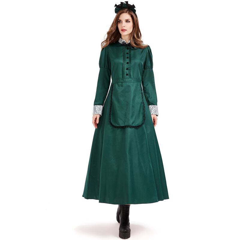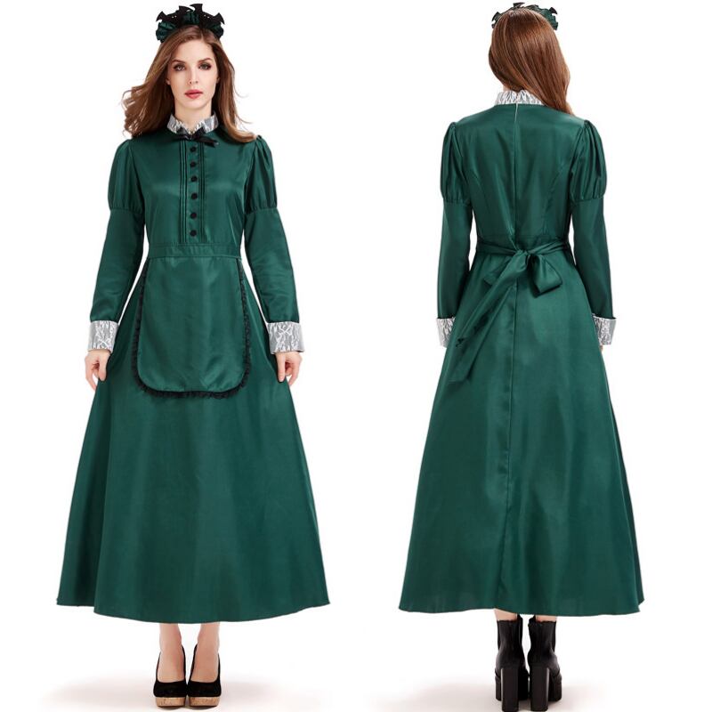 ロング丈のフレアドレスは、ハイウエストでスタイルアップを叶え、体型カバーにも優れた一着です。 ジュリエットスリーブとスタンドカラーがレトロでクラシカルな印象を与え、襟と袖口のレースがフェミニンな華やかさを添えます。グリーンのカラーが清楚で落ち着いた印象を与え、カチューシャ付きでトータルコーディネートも完成。ハロウィンや文化祭、学園祭などのイベントで、エレガントな存在感を放つ定番のコスチュームです。