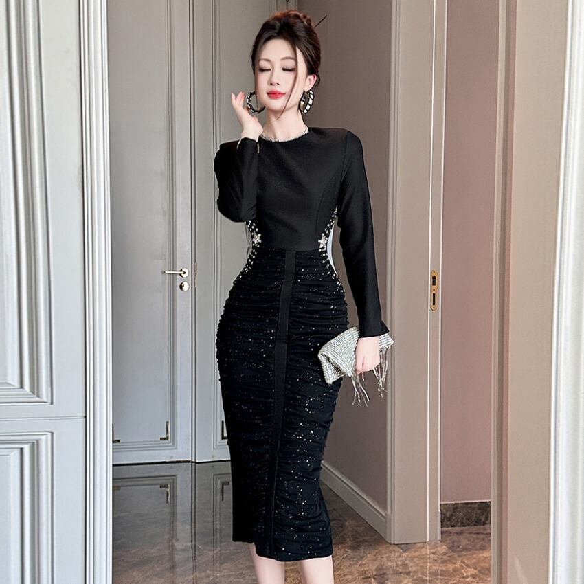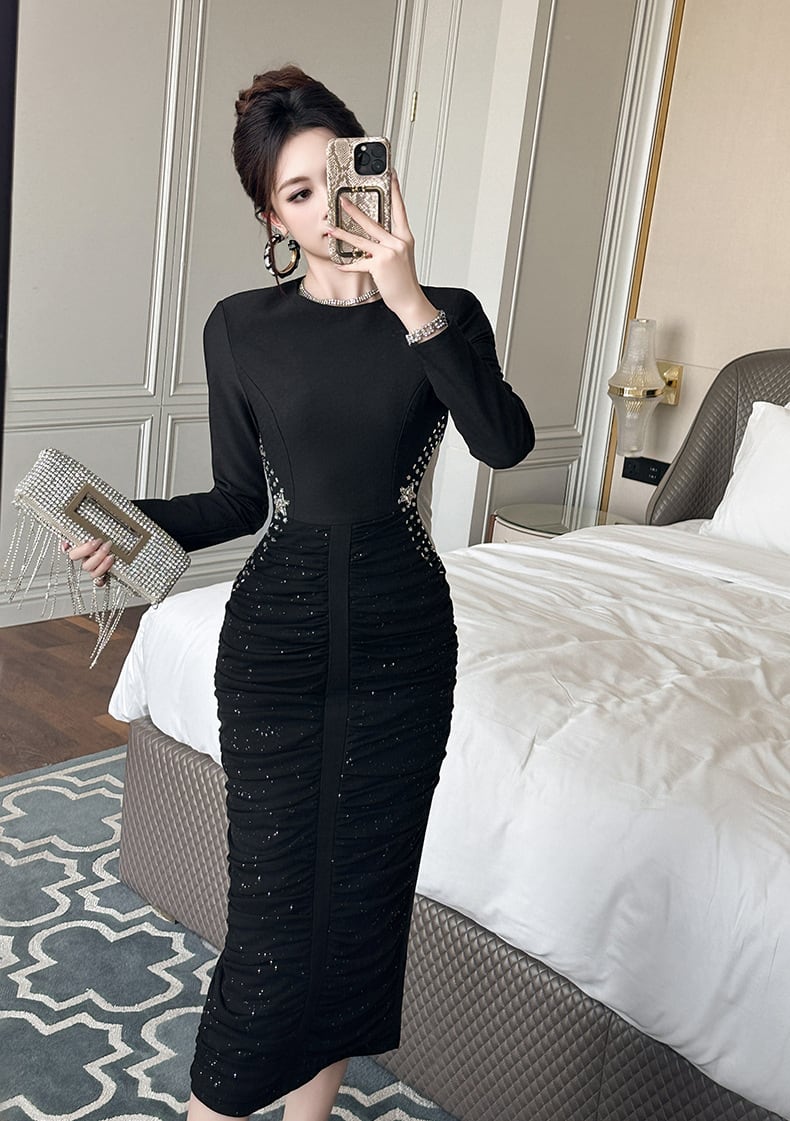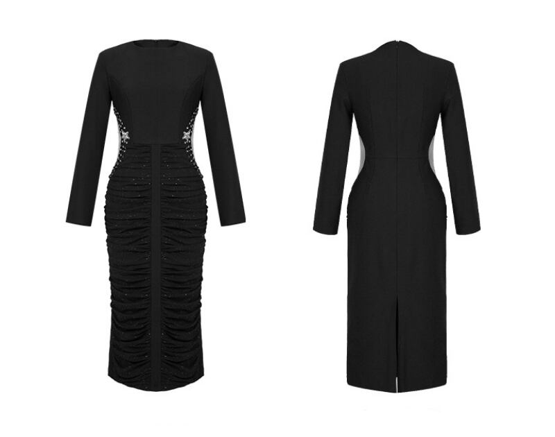 レディース ワンピース ドレス イブニングドレス 膝丈 膝下 ミモレ ミディ 長袖 ラウンドネック クルーネック タイト スリム 細身 スキニー ボディコンシャス アワーグラスライン ウエストマーク ハイウエスト ビジュー 大人可愛い きれいめ シンプル 上品 おしゃれ かっこいい エキゾチック 個性的 クール モード系 エレガント モダン 都会的 ラグジュアリー セクシー 色気 シック 華やか ゴージャス センシュアル リュクス 秋 冬 お呼ばれ パーティー ホテル スタイルアップ S 黒 ブラック