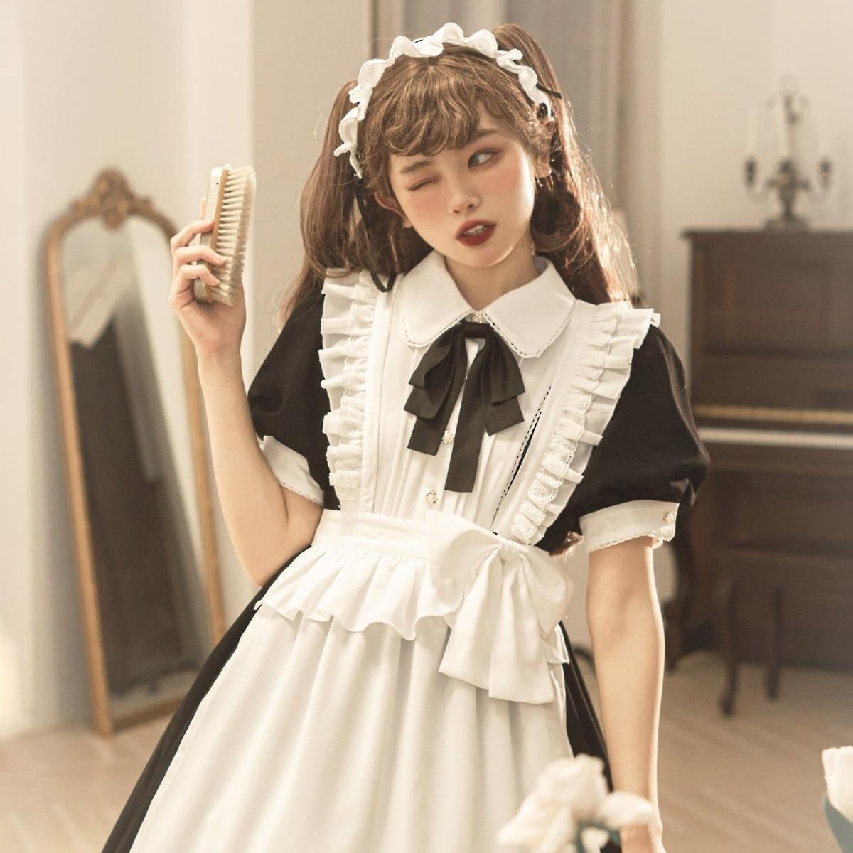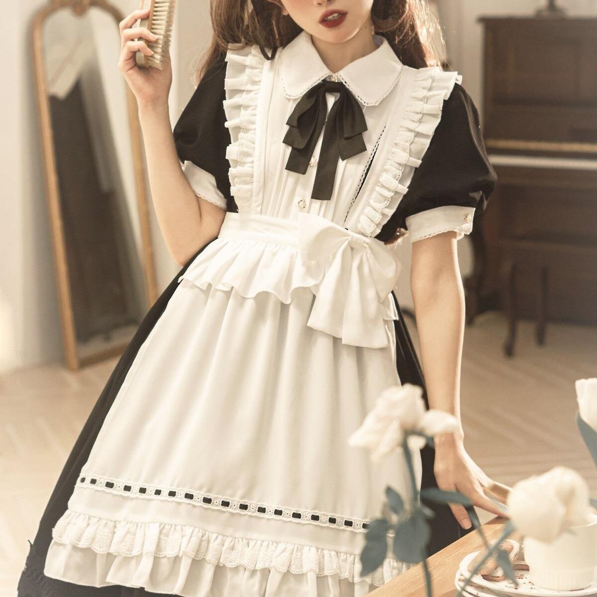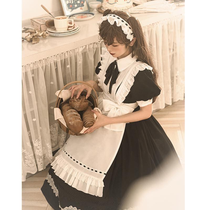3点セット エプロン ヘッドドレス付き レディース ワンピース セットアップ ミディ 半袖 襟付き りぼんタイ フレア Aライン リボン かわいい 大人可愛い きれいめ おしゃれ レトロ ガーリー 個性的 存在感 キュート ゴシック ロリータ 都会的 ロマンティック ドーリー 可愛い オールシーズン 文化祭 学園祭 20代 30代 パーティー イベント 休日 コスプレ 演劇 舞台 ハロウィン 韓国 オルチャン モテ インスタ映え 衣装 仮装 S M L ホワイト ブラック ベーシックカラー 大人カラー